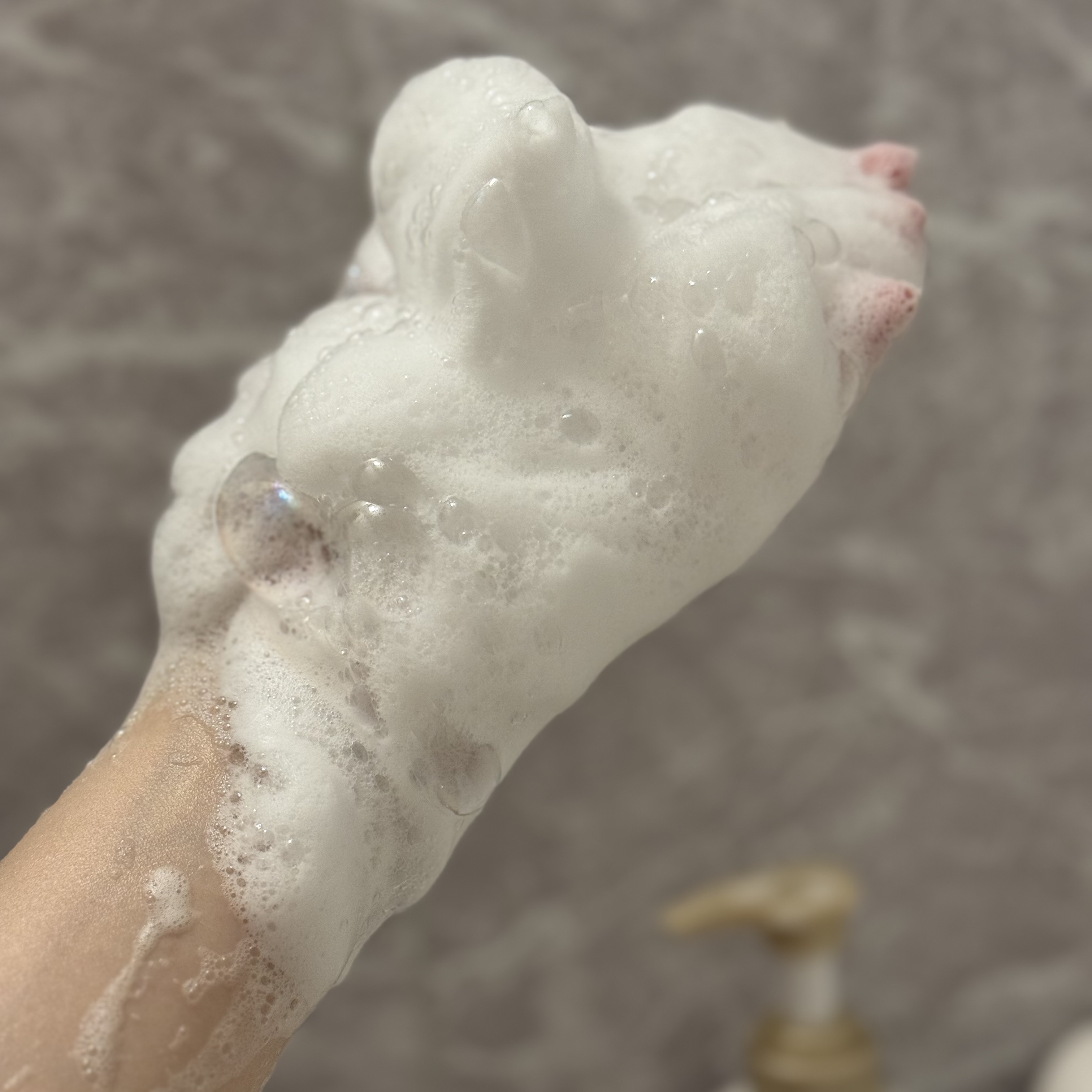 触ってみるとふっかふかで気持ちいい! クッションファンデのパフなので、 しっかりはしているんだけど 表面がふかふか柔らかめで 優しい触り心地が嬉しい🧸🌸 塗ってみると、水々しいので 保湿力はありつつサラサラに✨ 塗ってる感がないのに毛穴レス!!! ニキビなど気になる部分は ぽんぽんと2度のせしたら カバー力もめっちゃある🙆♀️🙆♀️ 水々しいので乾燥も感じにくく 使い心地とても良い( ・ω・ )/💓 1日さんざん喋り倒して、 帰宅したマスクには… 結構ファンデーションついてたけど ファンデ落ちたなぁ💦って感じの むけた感は全然ないので不思議🙄🌸