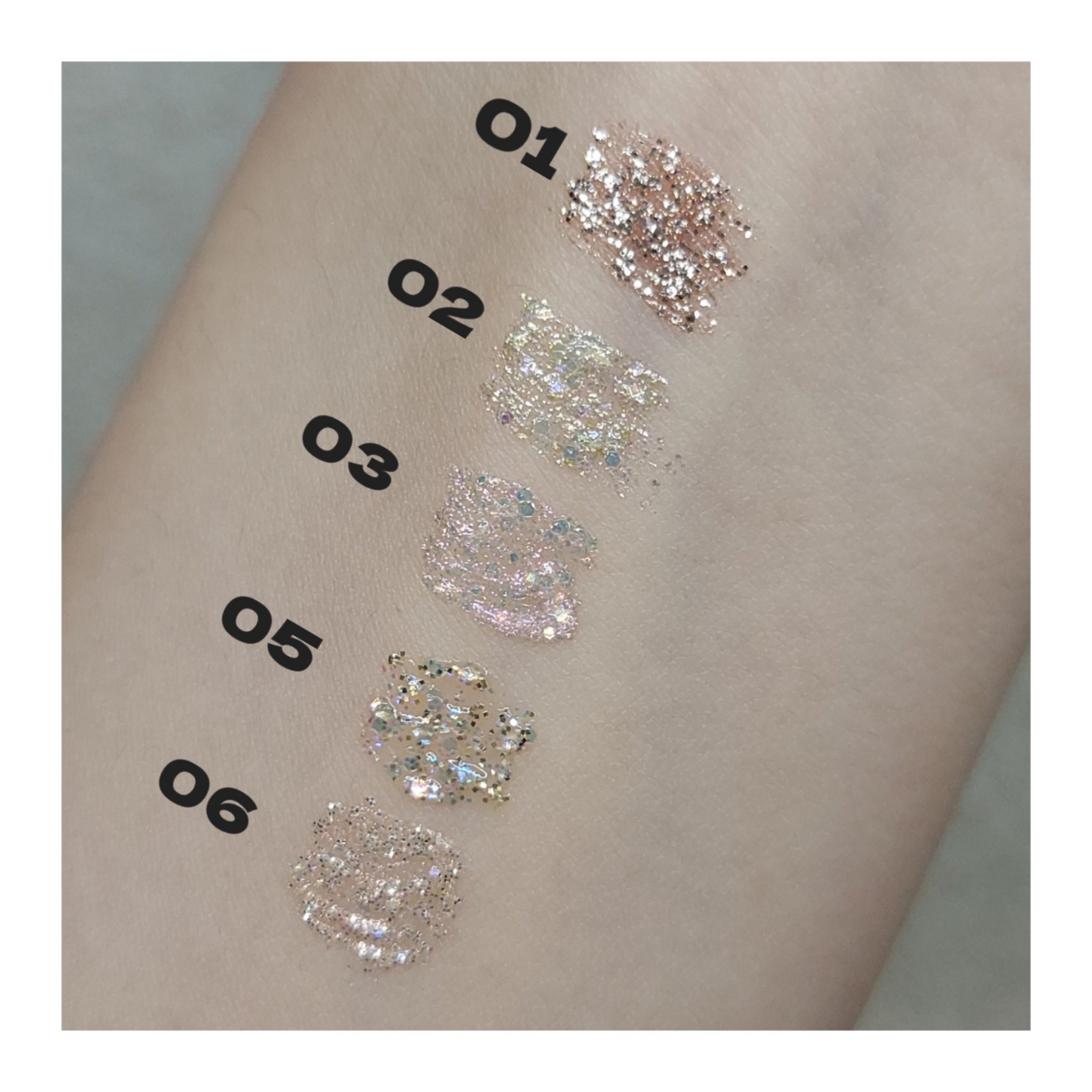 ふくれなちゃんプロデュースのグリッターが天才すぎる🥹 01.ピンクベージュ♡ピンク系♡小粒ラメ♡シルバーラメが多めに入っているのでめちゃめちゃ光ります! 02.トゥインクルスター♡イエロー系♡大粒ラメと繊細ラメ♡イエロー系ですが塗ってみると黄色として発色しなくナチュラルに使える色かなと思います! 03.ピンクスパークル♡ピンク系♡大粒ラメと繊細ラメ♡ピンクのラメが少し蛍光がかっているので写真では分かりにくいですが塗ってみると01と06に比べてかなりピンク味強いです💗 05.オーロラシャワー♡シルバー系♡大粒ラメと小粒ラメ♡見た目の通りの発色で銀色がそのまま着くという感じです! 06.デイリーベージュ♡ピンク系♡小粒ラメ♡薄めのピンクなのですがベージュ味があるのでかなりナチュラルなラメです!