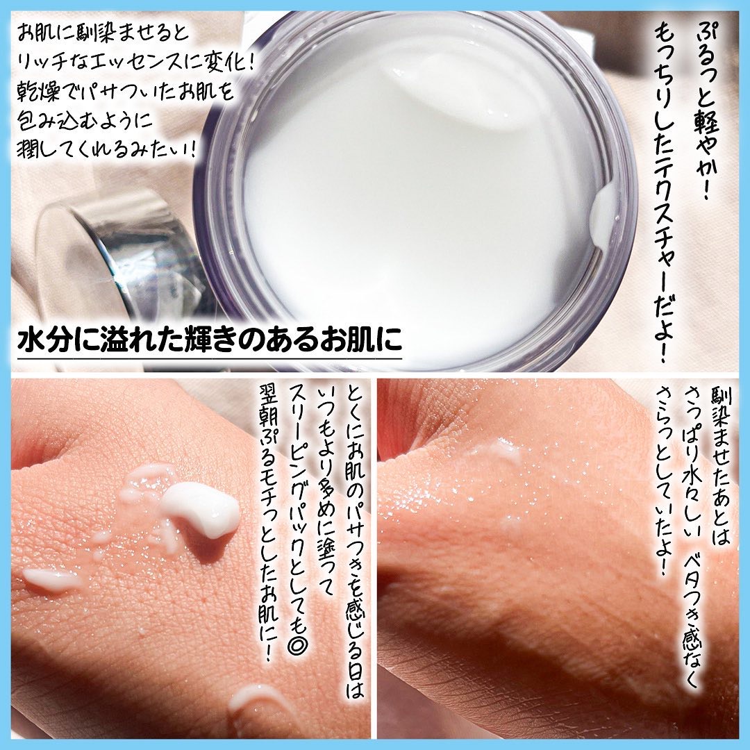杏仁豆腐の様なテクスチャーで、いつでも明るく輝きのある肌に導いてくれるクリームです😊 シミやくすみ、肌のハリや乾燥に悩みがある人にぜひ使って欲しいアイテムです! 肌に馴染ませるとエッセンスに変化して、すぐに潤いを実感できます。