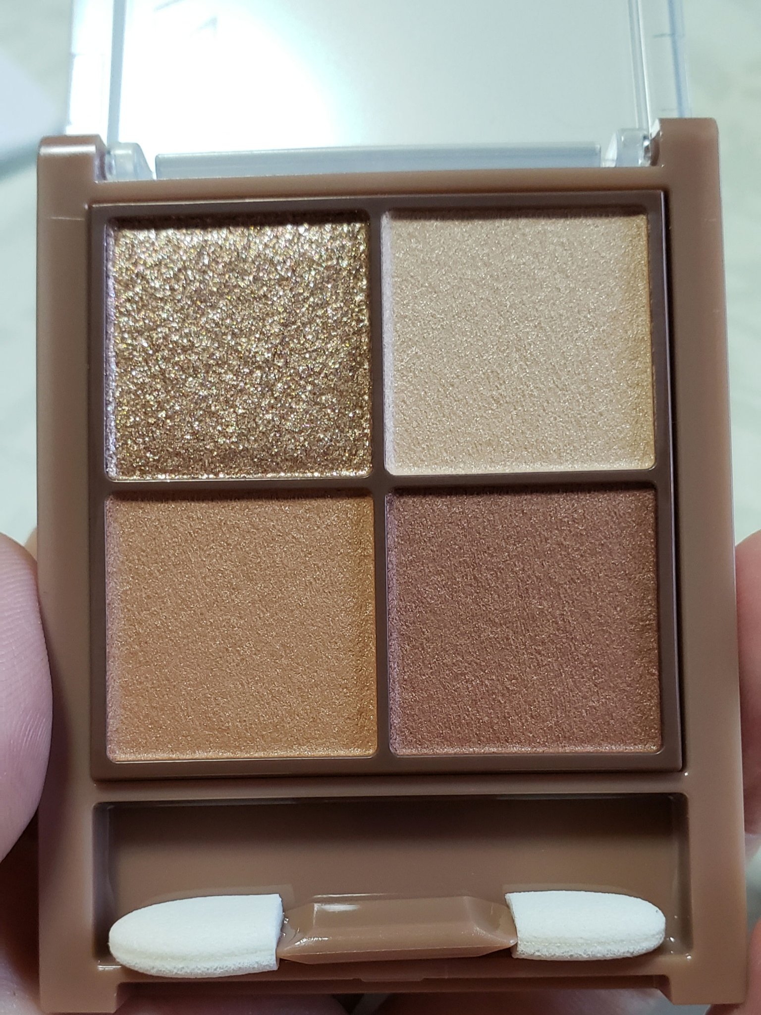 - 透け感マット×濃厚ブラウンの4色アイシャドウ。 しっかり目元を引き締めるビターなブラウンカラー。 透け感のあるブラウンを重ねて、自然な陰影のある目元へ。 ふんわり柔らかなパウダーなので、スルスル伸びてまぶたにピタッと密着。 保湿成分(スクワラン、ホホバ種子油)配合。