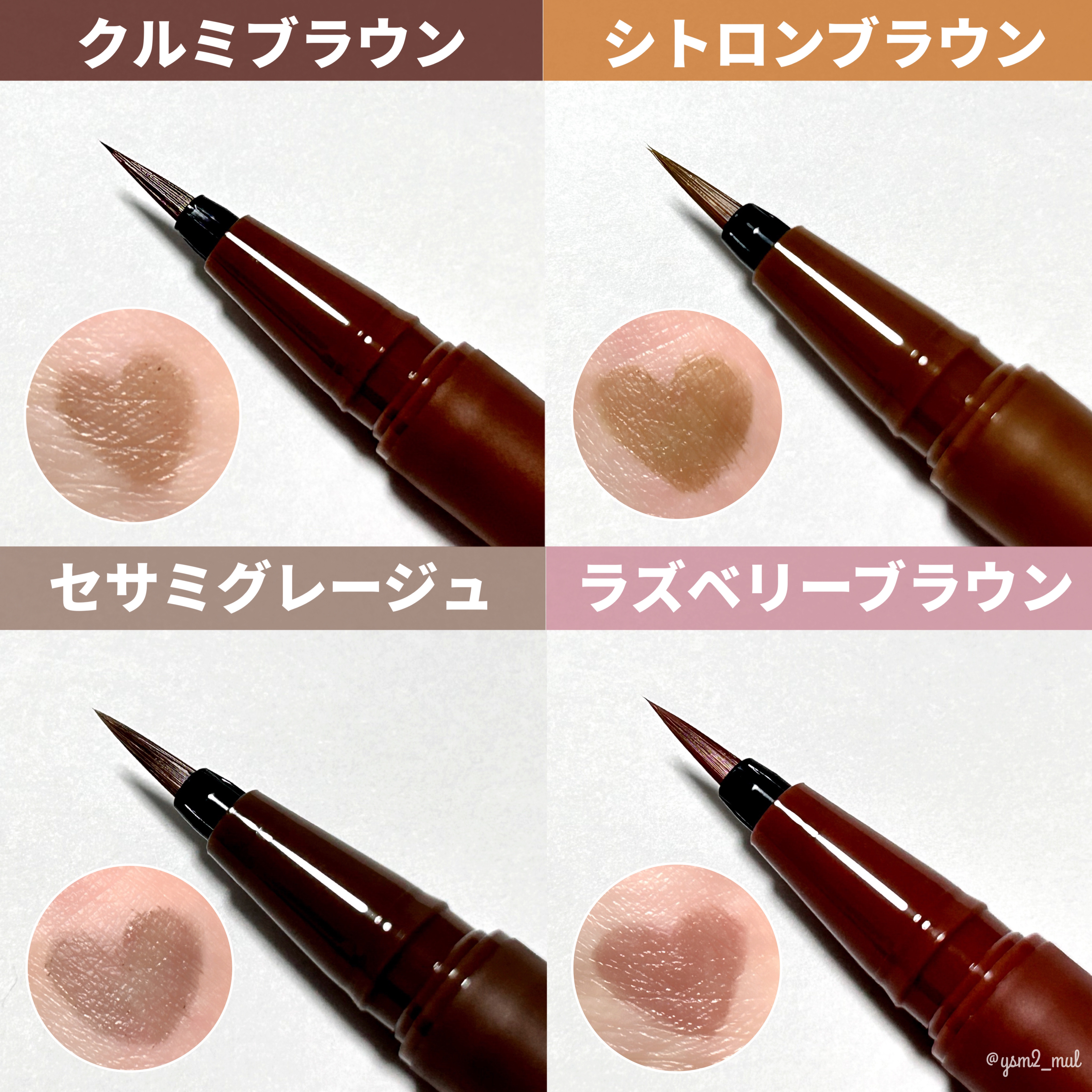 - 炭パウダー配合!ふんわり眉が長時間つづくリキッドアイブロウ! リキッドだけどテカらず、パウダリーな仕上がり。 リキッドだから眉尻まで長時間消えにくい! 本物のまゆげにみせる自然な薄付き発色 01 クルミブラウン…迷ったらこれ!使いやすい人気のブラウン 02 シトロンブラウン…明るめ黄みブラウン 03 セサミグレージュ…少し暗めのやわらかいグレージュ 04 ラズベリーブラウン…可愛い印象になるピンクブラウン