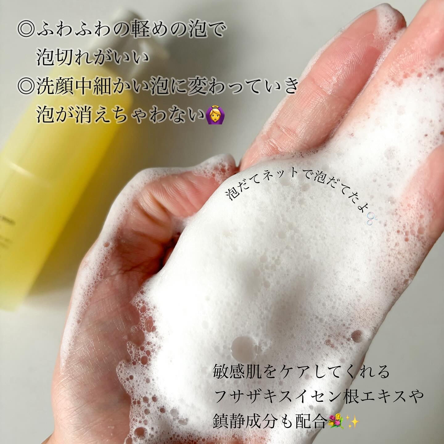 肌へのやさしさと洗浄力、しっとりした洗い上がり。そのすべてを叶える敏感肌のための洗顔料。 洗いすぎると肌のうるおいが取り去られ、洗浄力が弱いと汚れが落ちないというパラドックスに向き合い、肌へのやさしさ、洗浄力、うるおいの保持の3点をバランスよく兼ね備えています。 ポンプ式の容器で使いやすいし、ロック機能があるので、うっかり漏れるのを防げます。 薄い黄色のトロっとしたテクスチャーです。 泡立てネットで泡立てると、キメの細かい軽めの泡ができます。 ココナッツ由来の洗浄成分で、優しい使い心地です。 洗い流しもスムーズで、ヌルつきが残らずに、復活草やサトウキビなどの植物由来の効果によりすっきりしつつも、しっとり感もあります。 穏やかな品のある香りはハーバルな感じで魅力的です。 汚れを落とすだけではなく、使うほどにお肌の調子を整える美容液のような洗顔料です。 敏感肌をケアするスイセン根のエキスを配合しているので、生理前後にもお勧めです。