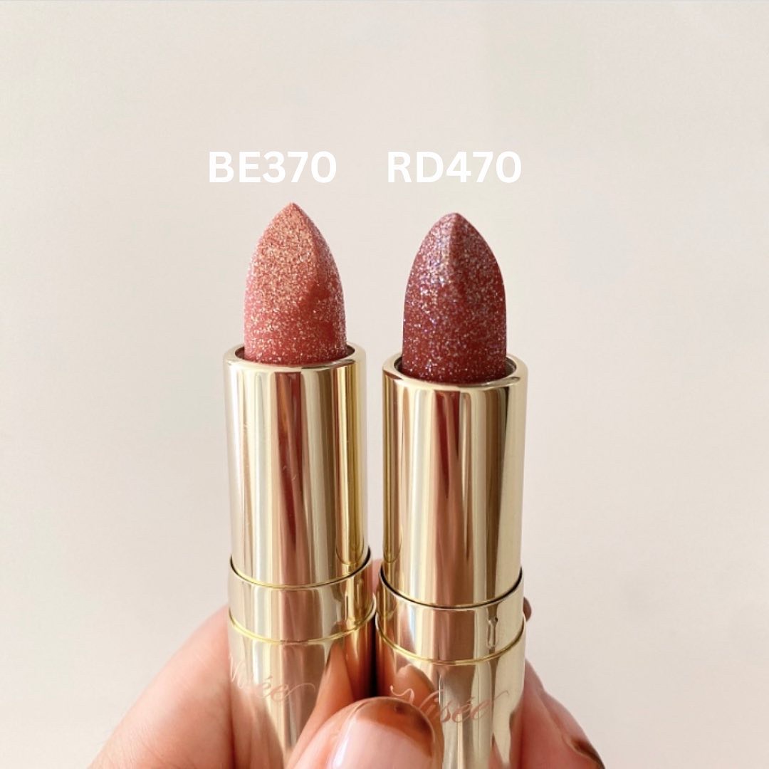 キラキラが眩しい宝石リップ 蛍光ピンクっぽい発色になると聞いて、ピンク系ではなくコーラルとガーネットの2色にしました 唇に塗ると自然な色味がほんのりつくティントになります 潤いも感じつつ、取れにくいのでリップよりもカジュアルに使っていけそうです BE370コーラルクォーツ RD470 ディープガーネット★限定色
