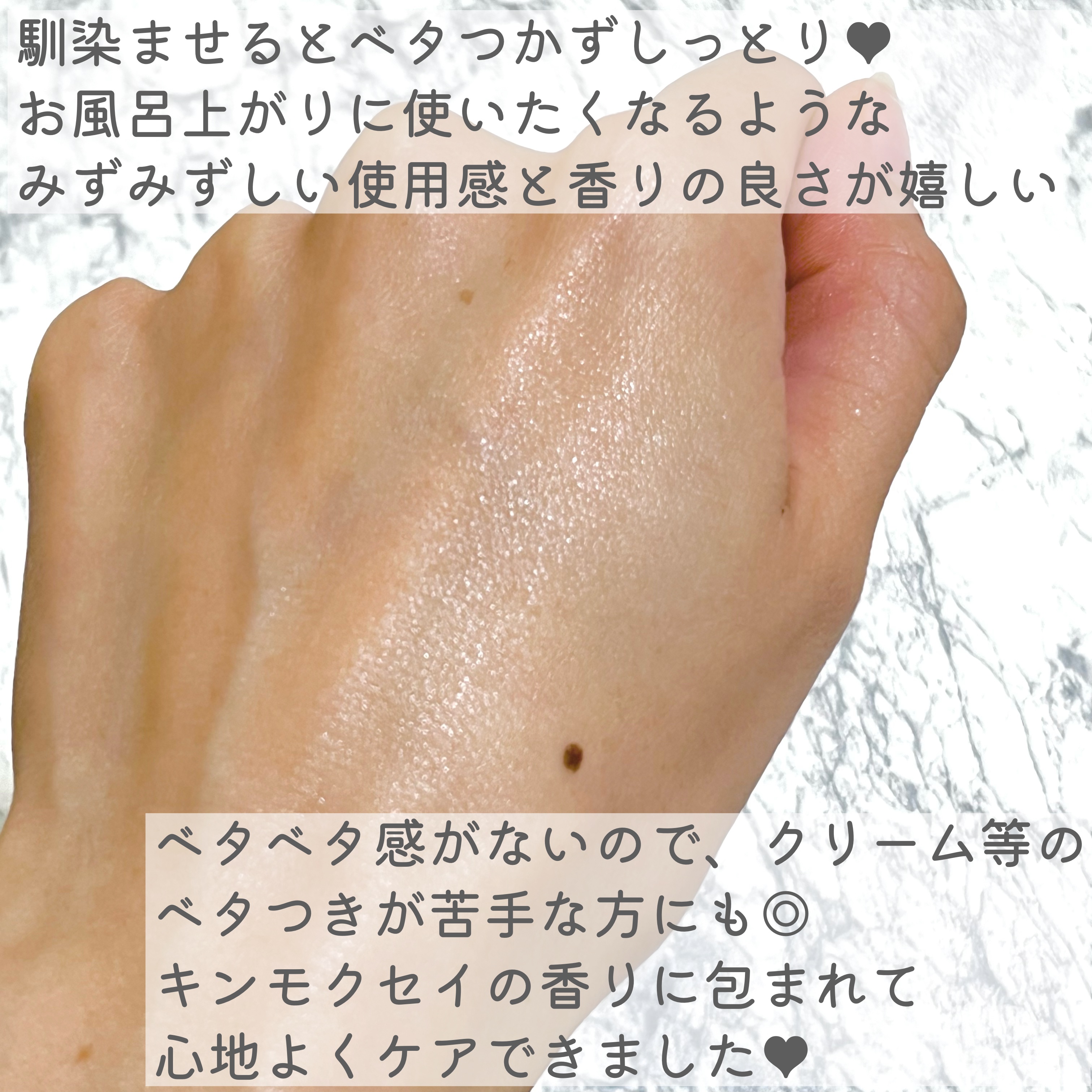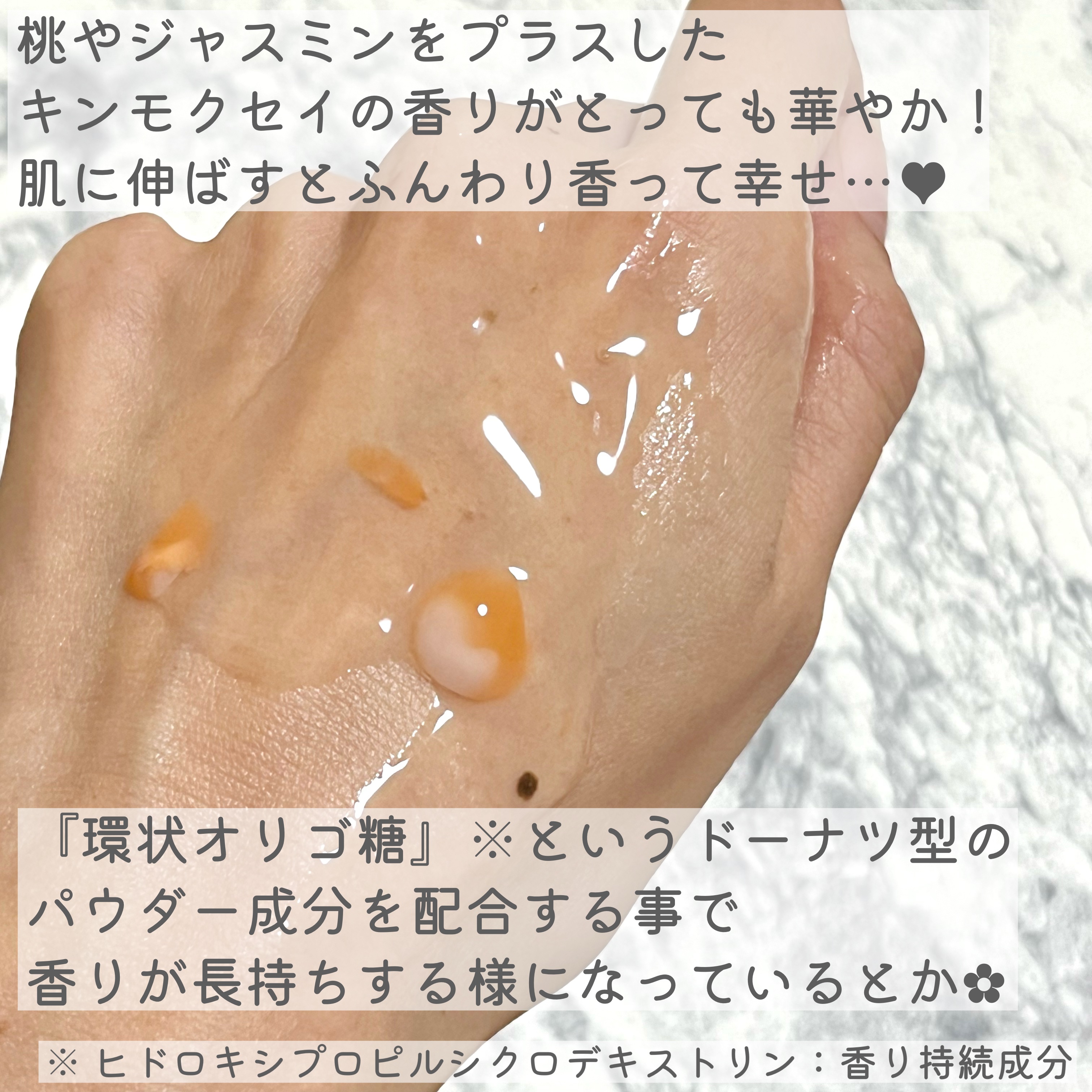 - 花びら※舞うモイストジェル。高保湿タイプ スッとなじむ花びら状ゲルがみずみずしく肌をうるおし、艶やかで透明感のあるお肌に導きます。 ※花びら状ゲルです。本物の花びらではありません。 【キンモクセイの香り】 桃やジャスミンをプラスした華やかなキンモクセイの香り