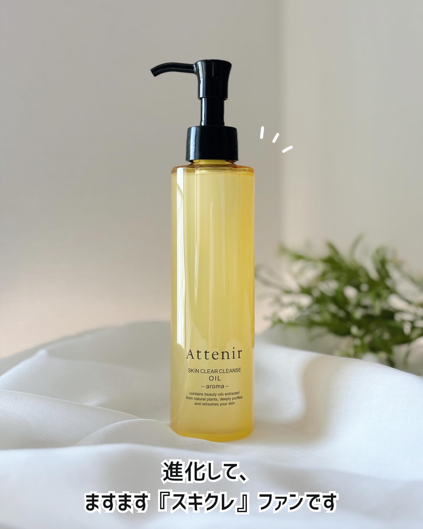 アテニアの人気クレンジングの スキンクリアクレンズオイルが2023年11月15日にリニューアル! 角層をほぐし緩める事で、次に使うスキンケアの浸透を高めて透明感をもたらす美容クレンジングに進化! 配合されている美容オイルは計8種類になり、メイクを落とすだけなく素肌の透明感にも働きかけます。 テクスチャーはとろみのある化粧水みたいな感じでいい意味でオイルっぽさが少ないです。 旧品と比べて、クッション性がUPしていて摩擦を気にする事なくメイクを落とせます! メイク落ちも良くWPマスカラも乳化させるとほとんど落ちます。 柑橘系の香りでクレンジング中もとても癒されます! 旧品よりさらにパワーアップしたオススメのクレンジングです!