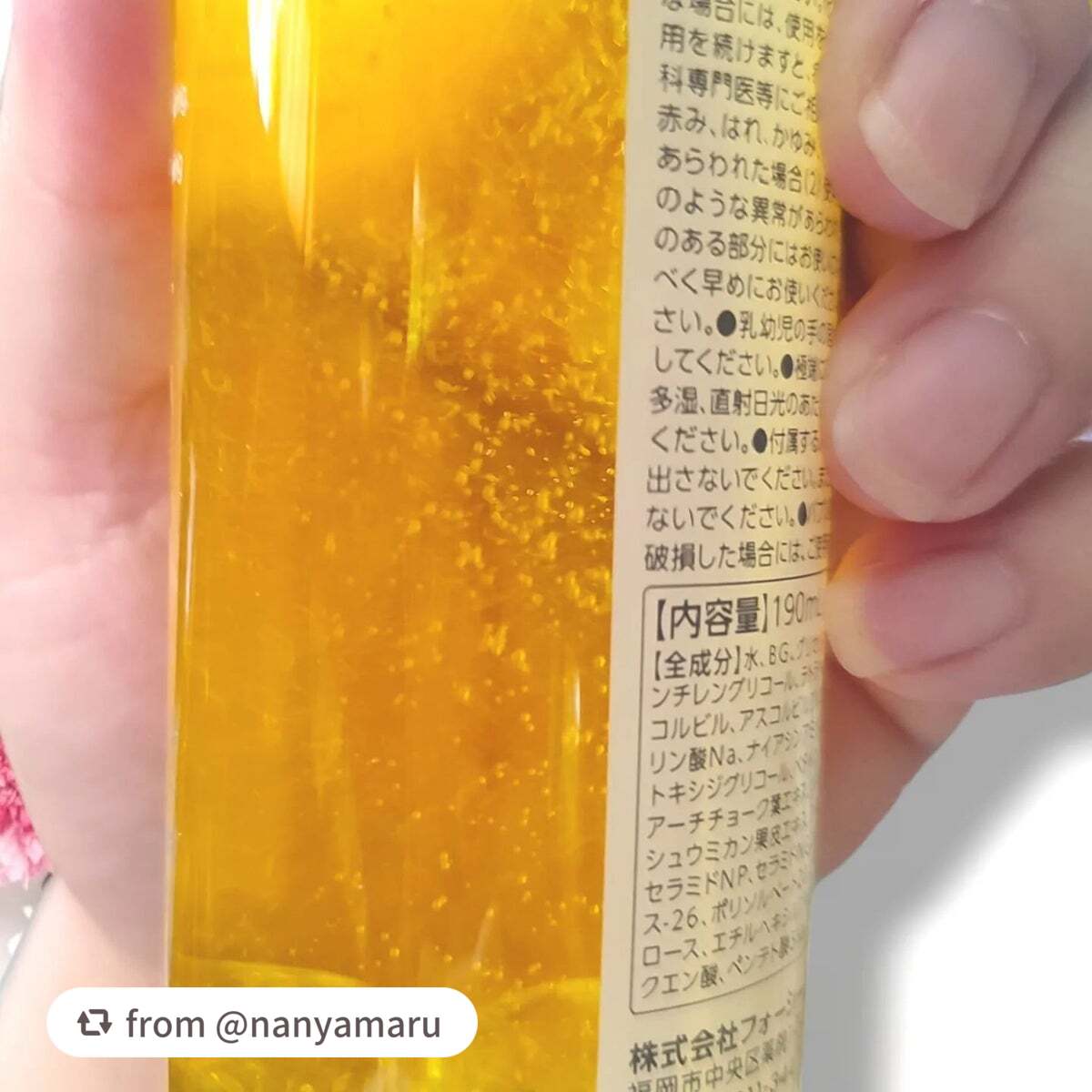 - <190ml> 水、ペンチレングリコール、BG、グリセリン、ヒアルロン酸Na、フェノキシエタノール、ノイバラ果実エキス、セラミドNG、エチルヘキシルグリセリン、ヒドロキシエチルセルロース、クエン酸、セラミドNP、ベタイン、セラミドAP、テトラヘキシルデカン酸アスコルビル、アスコルビルグルコシド、ペンテト酸5Na、ポリソルベート20、アスコルビルリン酸Na、クエン酸Na、ウンシュウミカン果皮エキス、アーチチョーク葉エキス、ナイアシンアミド、エトキシジグリコール、ツボクサ葉エキス、ワイルドタイムエキス、グリセレス-26、リンゴ果実水