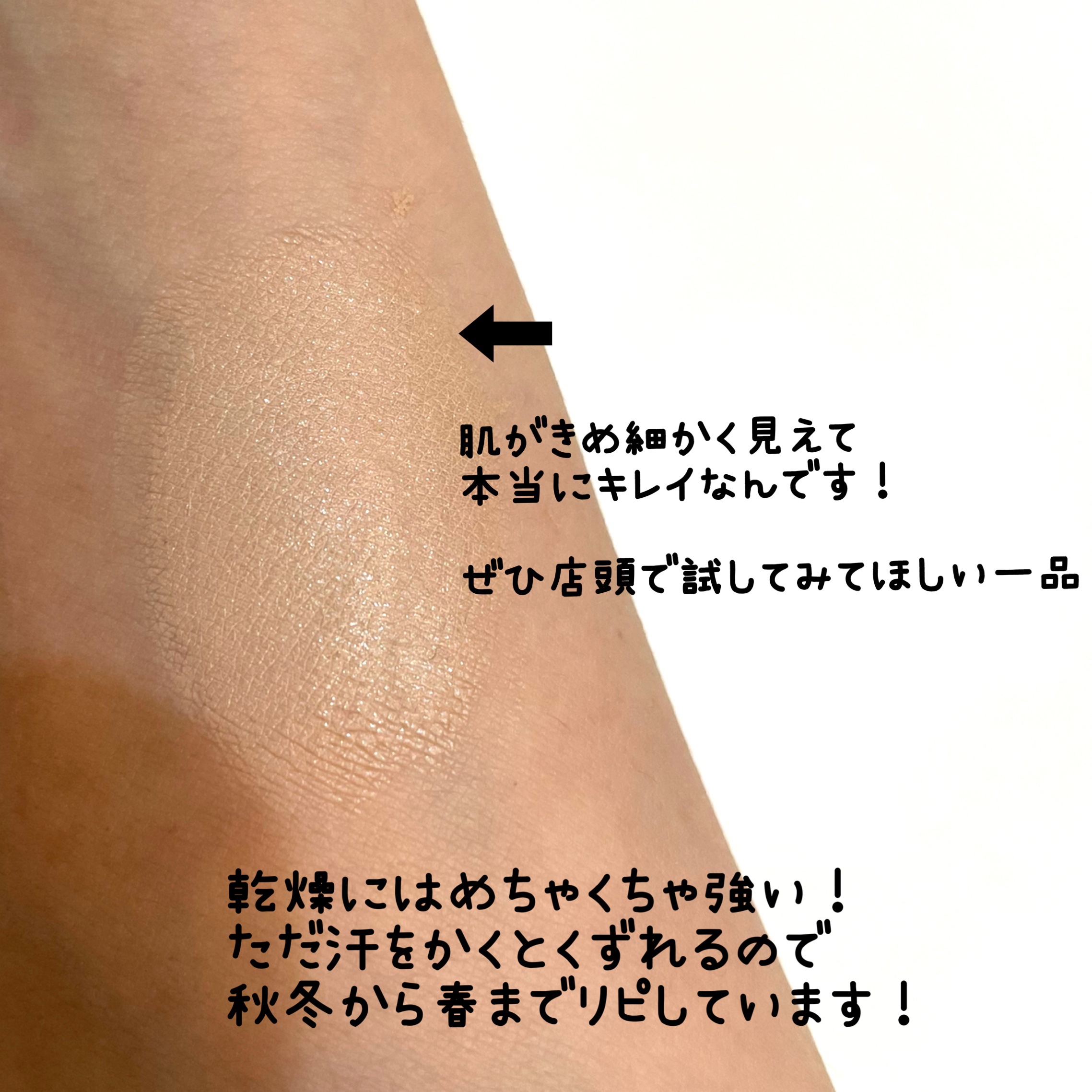 圧倒的なツヤ!ツヤというか光です!頬が光る! ツヤの効果でくすみも小皺も毛穴も飛ばしてくれる! ツヤが倍増する! 美容液級のうるおい!ツヤ感がキレイ! 諭吉ファンデの王道!クリームタイプでカバーもしつつうるおいとツヤが爆上がり! 日焼け止め効果が高いのにトーンアップ効果もあり、程よくくすみもカバーしてくれる