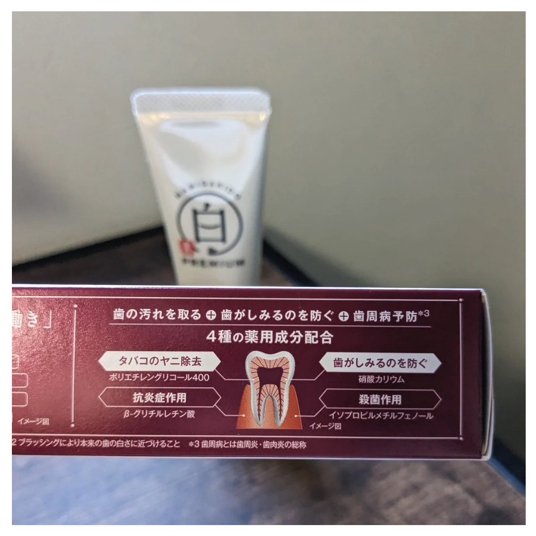 - 【医薬部外品】磨くほど白く。美白成分2倍配合(*1)、4種の薬用成分配合のホワイトニングペースト プレミアムタイプ。美白(*2)・知覚過敏ケア・歯周病ケア(*3)に。 ●効果・効能:歯を白くする/歯槽膿漏(歯周炎)の予防/歯肉炎の予防/口臭の防止/口中を浄化する/むし歯の発生及び進行の予防/タバコのヤニ除去/歯がしみるのを防ぐ/口中を爽快にする ●【4種の薬用成分】ポリエチレングリコール400(タバコのヤニ除去)、 硝酸カリウム(歯がしみるのを防ぐ)、β-グリチルレチン酸(抗炎症作用)、イソプロピルメチルフェノール(殺菌作用) *1 清掃助剤:リン酸三カルシウム、ヒドロキシアパタイト、ケイ酸カルシウム 薬用歯磨き堂ペーストNと比較して *2 ブラッシングにより本来の歯の白さに近づけること *3 歯周病とは歯周炎・歯肉炎の総称 ※パッケージデザイン等は予告なく変更されることがあります
