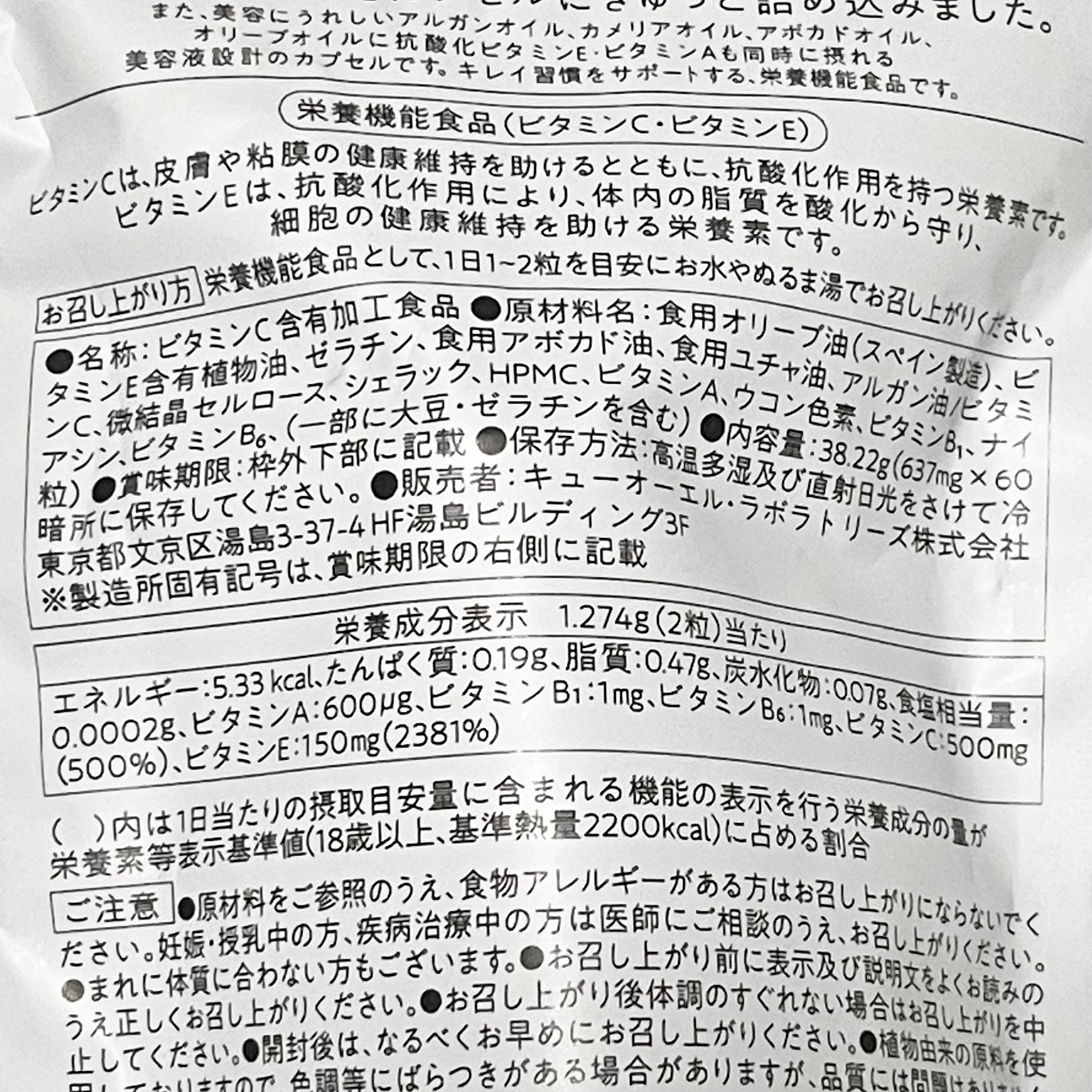 - 時間をかけてじっくり溶ける多重構造のビタミンCビーズをカプセルにぎゅっと詰め込みました。また、美容にうれしいアルガンオイル、カメリアオイル、アボカドオイル、オリーブオイルにビタミンE・ビタミンAも同時に摂れる美容液設計のカプセルです。 キレイ習慣をサポートする、栄養機能食品です。 【栄養機能食品(ビタミンC・ビタミンE)】 ビタミンCは、皮膚や粘膜の健康維持を助けるとともに、抗酸化作用を持つ栄養素です。 ビタミンEは、抗酸化作用により、体内の脂質を酸化から守り、細胞の健康維持を助ける栄養素です。 ●本品は、多量摂取により疾病が治癒したり、より健康が増進するものではありません。 ●1日の摂取目安量を守ってください。 ●本品は、特定保健用食品と異なり、消費者庁長官による個別審査を受けたものではありません。 ●食生活は、主食、主菜、副菜を基本に、食事のバランスを。