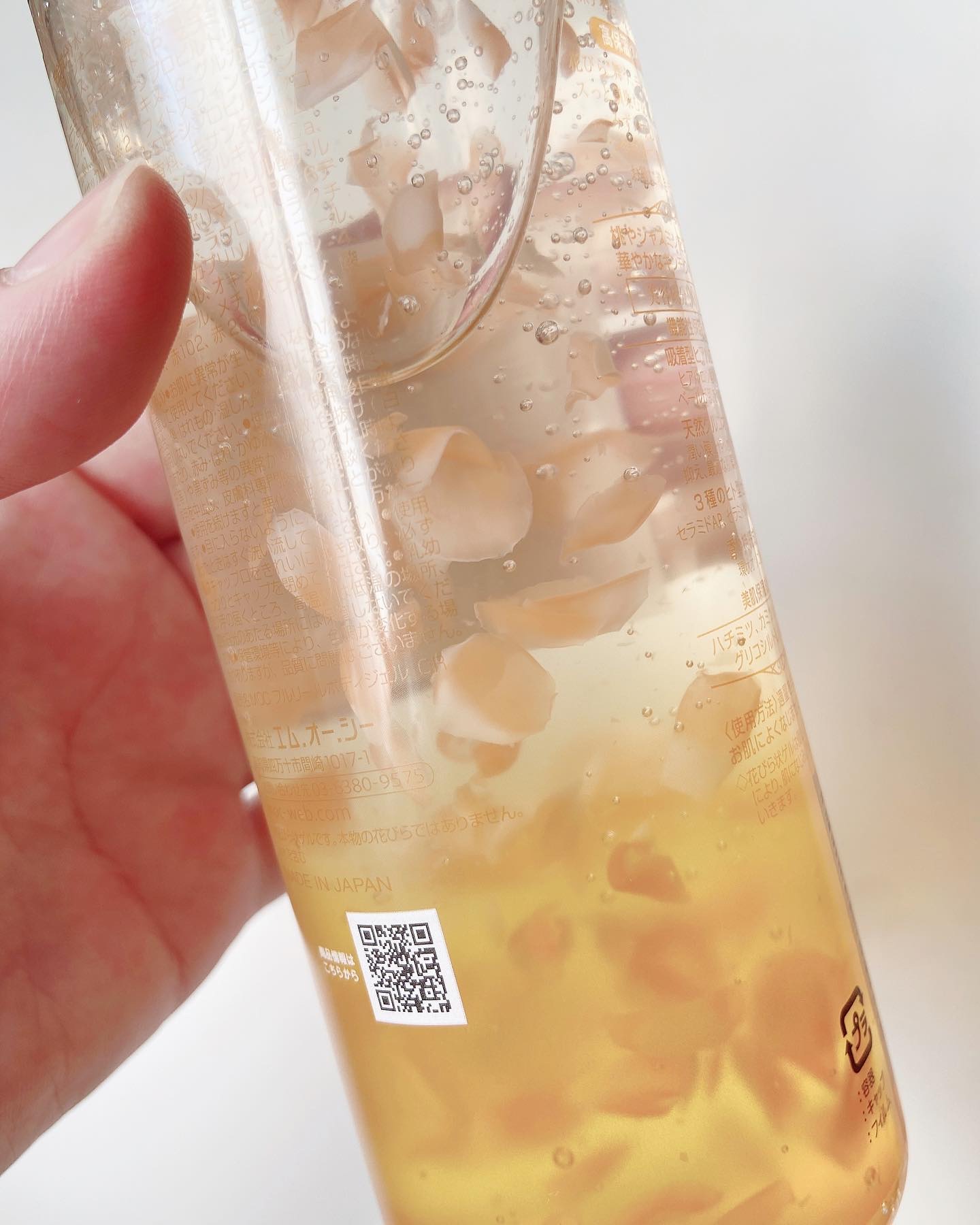 ぷるんとした少しとろみのあるテクスチャーで みずみずしく伸び広がり、花びら状※ゲルは少しかため ですがやさしく押すととろけてスッと馴染みました。 ベタベタしないのでお風呂上がりに使用しても 服についてしまうことなく、美容液成分90%配合で潤いが続き、しっとりとして乾燥しやすい肌が 時間が経ってもカサついてこなかったのも嬉しいです😊 桃やジャスミンをプラスした、華やかなキンモクセイの香りがしばらくふわっとするのもお気に入りꕤ୭*
