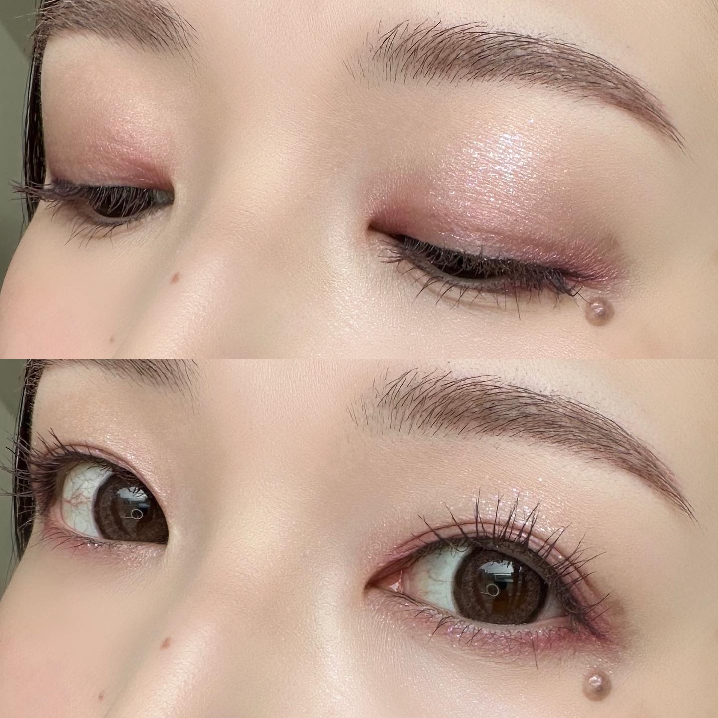 手に試した感じではベースのブルーは弱く、ラメ自体がブルーで可愛すぎる…! BAさんはパウダーアイシャドウのベースにもおすすめと教えてくれたので、 今日はこちらをベースにピンクブラウン系の アイシャドウを使ってメイクしてみたよ🫶🏻 肌に伸ばすとすぐにサラサラになるから ベタベタが残ったりしないし、 パウダーアイシャドウの上に重ねてもヨレない◎