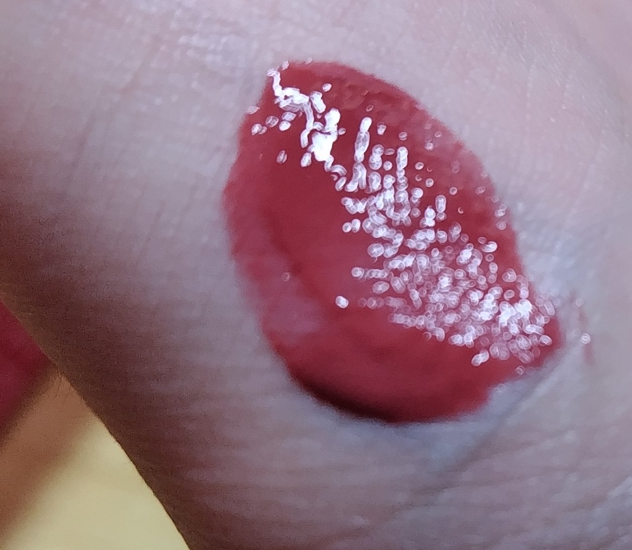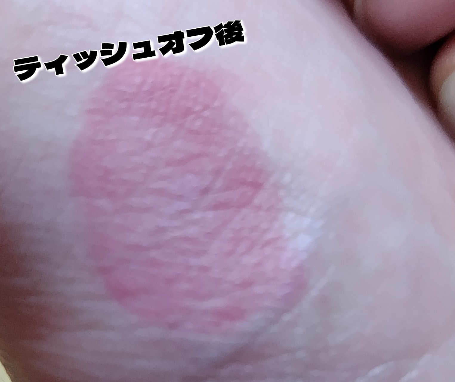 開封してみるとイチジクの香りがふんわりと香ってきました…! 色も可愛いですよね( ^ν^) ティッシュオフ後もバッチリとした発色! 初めてティント使ってみたらとっても難しいことに気づいてしまった…! 写真の映りぐわいとか悪すぎてごめんなさいm(_ _)m