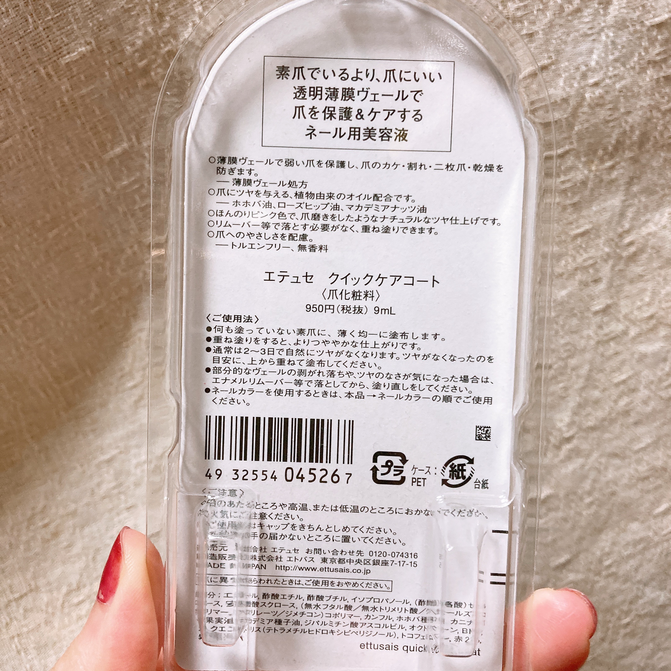 - 素爪でいるより、爪にいい。速乾!リムーバーいらず!透明薄膜ヴェールで爪を保護&ケアする、ツヤ出しネール用美容液。 弱い爪を摩擦や乾燥から保護し、爪のカケ・割れ・二枚爪・乾燥を防ぎます。 塗布すると、エッセンスコート成分が均一な薄膜をつくり、ナチュラル光沢成分&植物オイル(*)が自然なツヤを与えます。 ほんのりピンク色で、爪磨きしたようなナチュラルなツヤ仕上げです。 トルエンフリー、無香料で爪へのやさしさを配慮。 通常のトップコートやハードナーは、一部はがれると、厚みがあるため、凹凸になりますが、「クイックケアコート」は、厚みのない薄膜仕上げなので、落とさず、上から塗布してもキレイになじむので、リムーバーいらずです。 *ホホバ油・ローズヒップ油・マカデミアナッツ油 <こんな時におすすめ> ・爪を保護しながらツヤも出るので、マニキュアをお休みしたい時に ・超速乾だからササッと簡単にケアしたい時に ・ナチュラルなツヤ、仕事上ネールNGでもキレイに見せたい時に 【価格改定について】 いつもご愛用いただきありがとうございます。 この度、原材料高騰などにより、2025年9月1日より、希望小売価格の変更を行うこととなりました。 何卒ご理解を賜わりますよう、心よりお願い申し上げます。 エテュセ クイックケアコート 旧価格 税込1,045円(税抜950円) ↓ 新価格 税込1,265円(税抜1,150円)