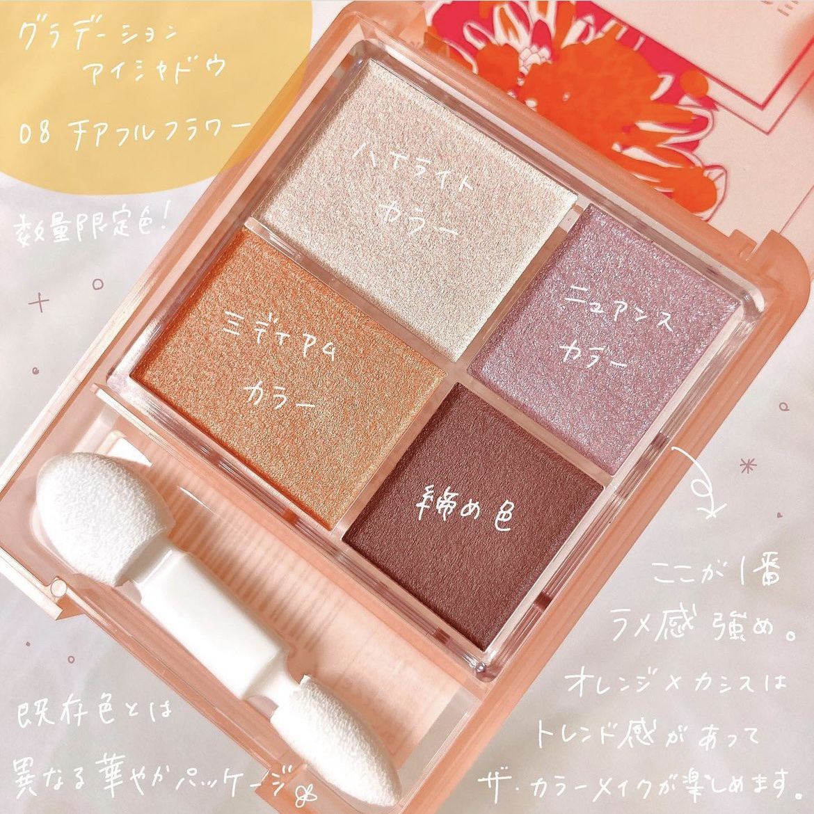 | アイシャドウパレットランキング第8位 | 時間が経っても キッラキラな艶・ラメ感が続く。 色がくすんだりも気にならないし 塗ったあとに何回も鏡見てしまう | 詳細を見る |