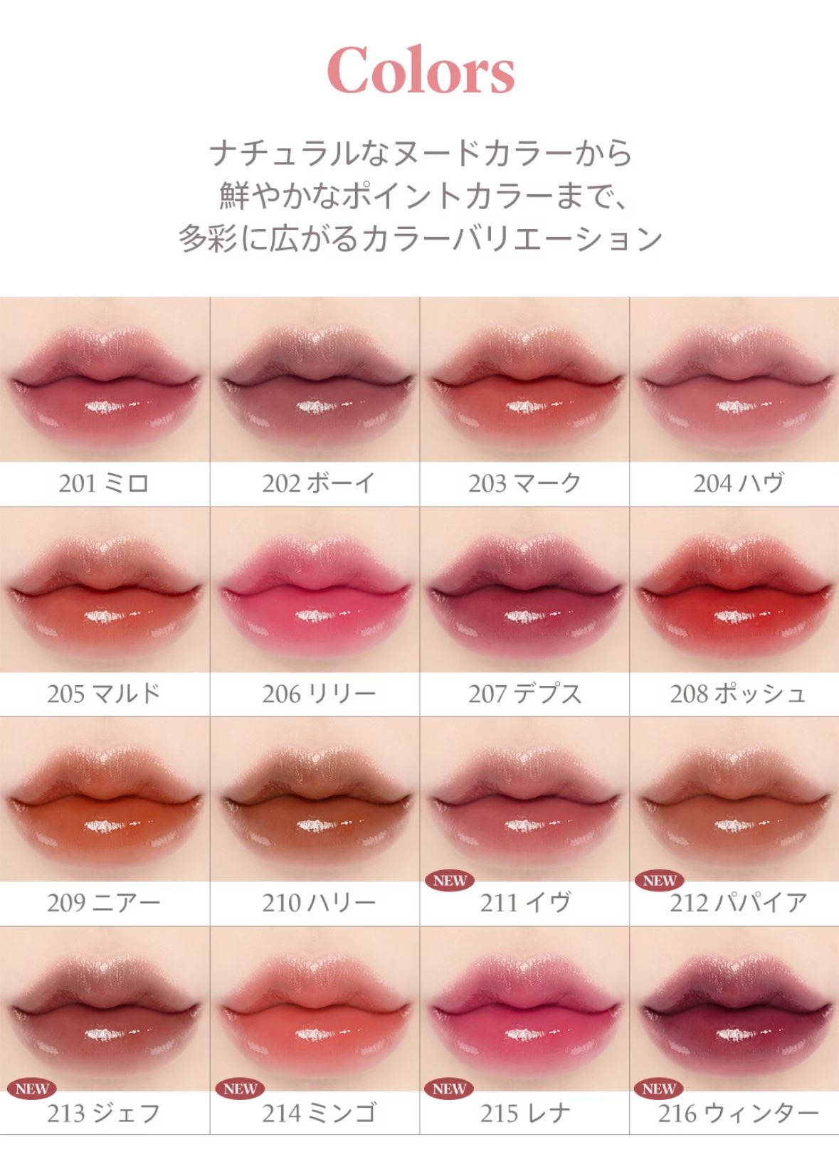- Point1 透き通った気品が感じられるカラー ユニークなヌードカラーから自然なニュートラルカラー、深くて密度のあるポイントカラーまで、さまざまな好みに合わせた幅広いカラーバリエーション。それぞれのカラーが持つ明度や彩度に合わせて透明感を細かく調整しているため、グラデーションリップやオーバリップなど、プロが施したようなさまざまなリップメイクが楽しめます。また、夕方の暗い空間や、室内の光の下でも、唇本来の色にリップスティックのカラーが馴染み、水彩画のようなナチュラルな発色で、自然な血色感のある唇に演出します。 Point2 光に包まれたガラス玉のようなきらめき Lakaならではの「ボンディンググロウ」フォーミュラで、唇に触れた瞬間、体温でやさしく溶けていくようなテクスチャー。しっとりと馴染んで密着しながら唇をコーティングしてくれます。高い屈折率で光を強く反射させるハイシャインオイルコンプレックスを配合し、光沢感のある生き生きとしたリップカラーを実現しました。