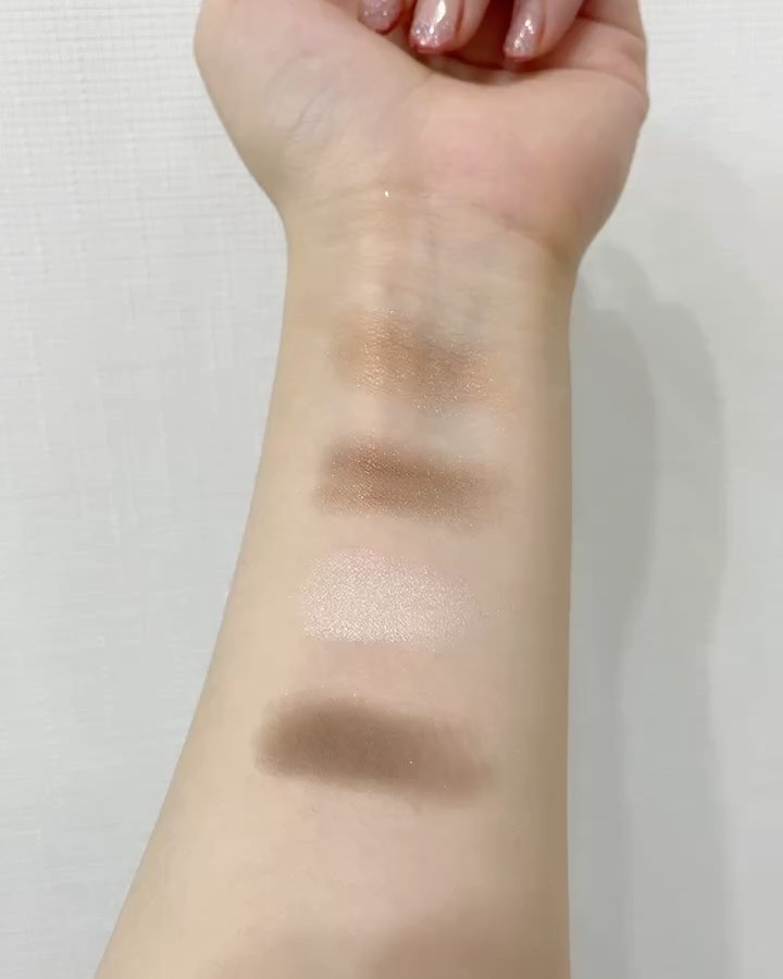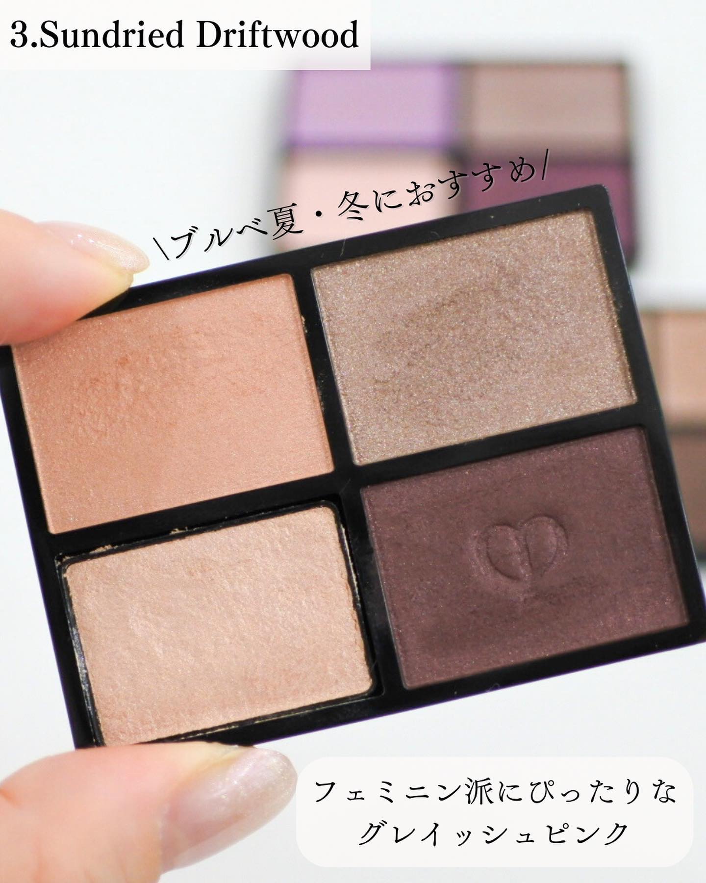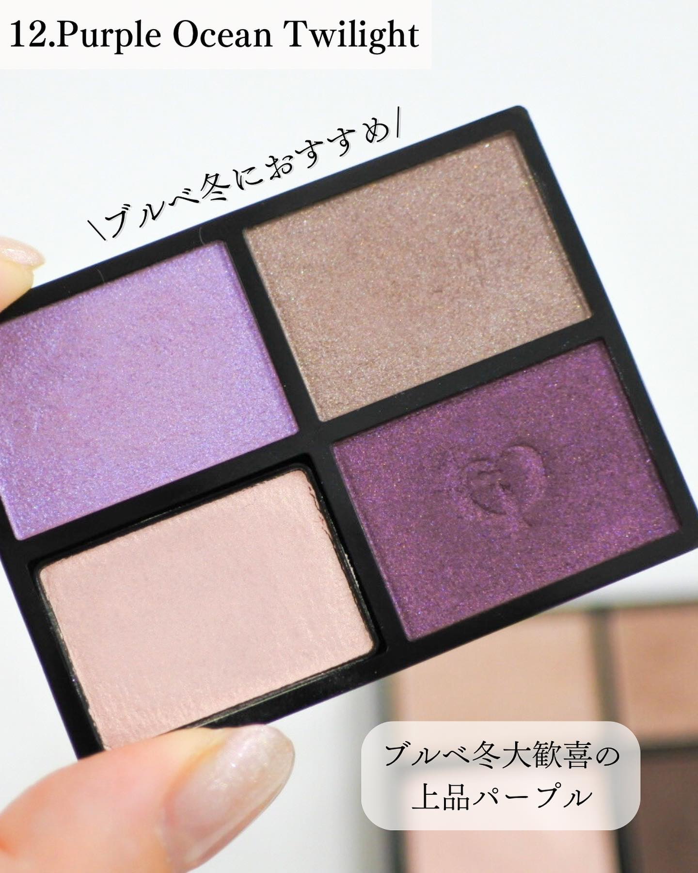 青み寄りのスモーキーカラーが並んでいます。 くすみのカラーが得意なゾーンの人ですが、ラメ、パールのカラーをしっかりと仕込み、くすみを飛ばすとブルベ冬の方でも使いやすいです♡ こういう色を持っているとオフィスメイクをするときに役に立つのでおすすめですよ!