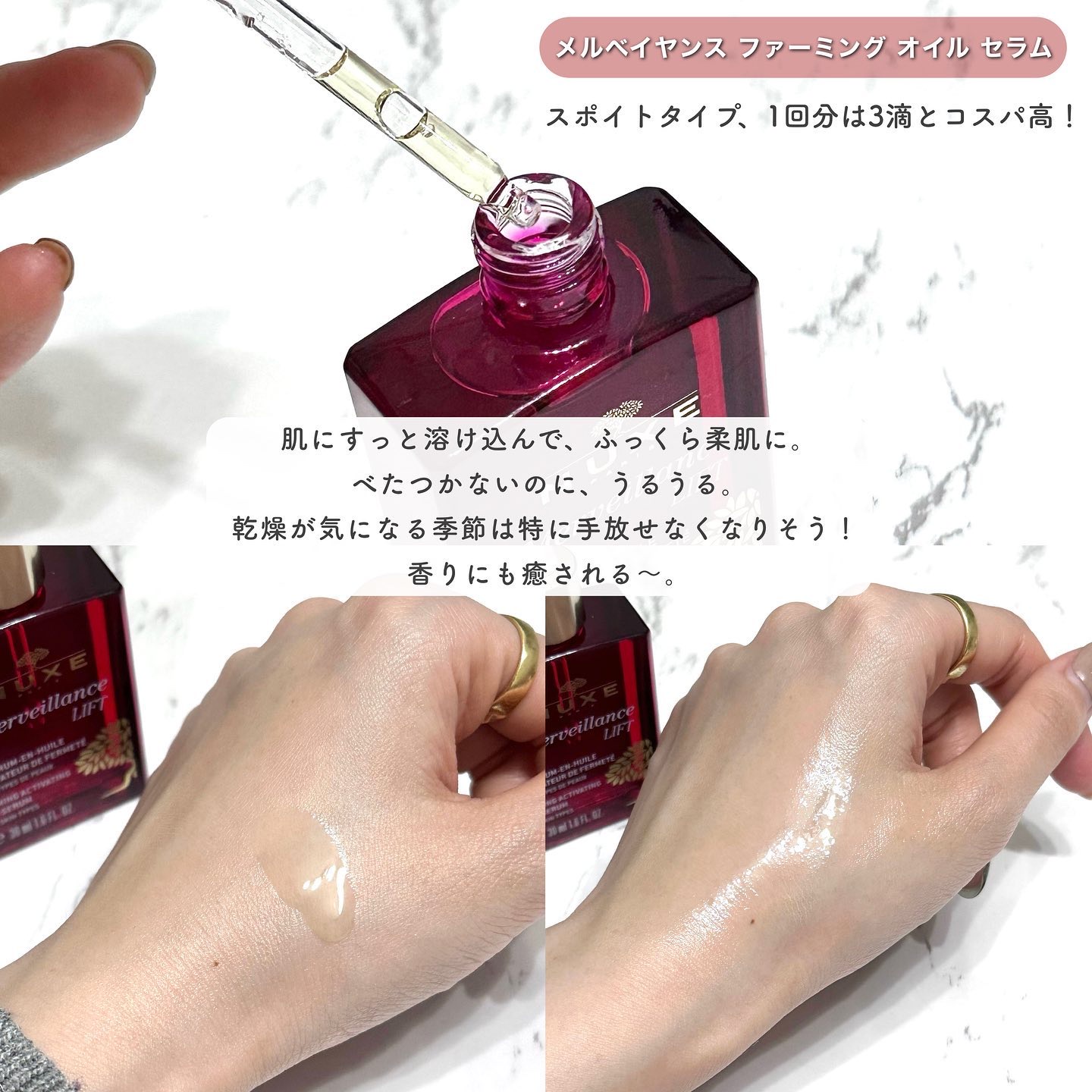 自然由来成分96~98%配合のエイジングケア*美容オイルで、肌に溶け込むようになじみ、ふっくらとハリのある肌に整えてくれるよ。 さらりとしたテクスチャーが肌にすばやくなじみ、すべての肌タイプの方に使えそうな心地よい使用感だったよ! ライトなフローラルの香りが気分を高めてくれるよ。