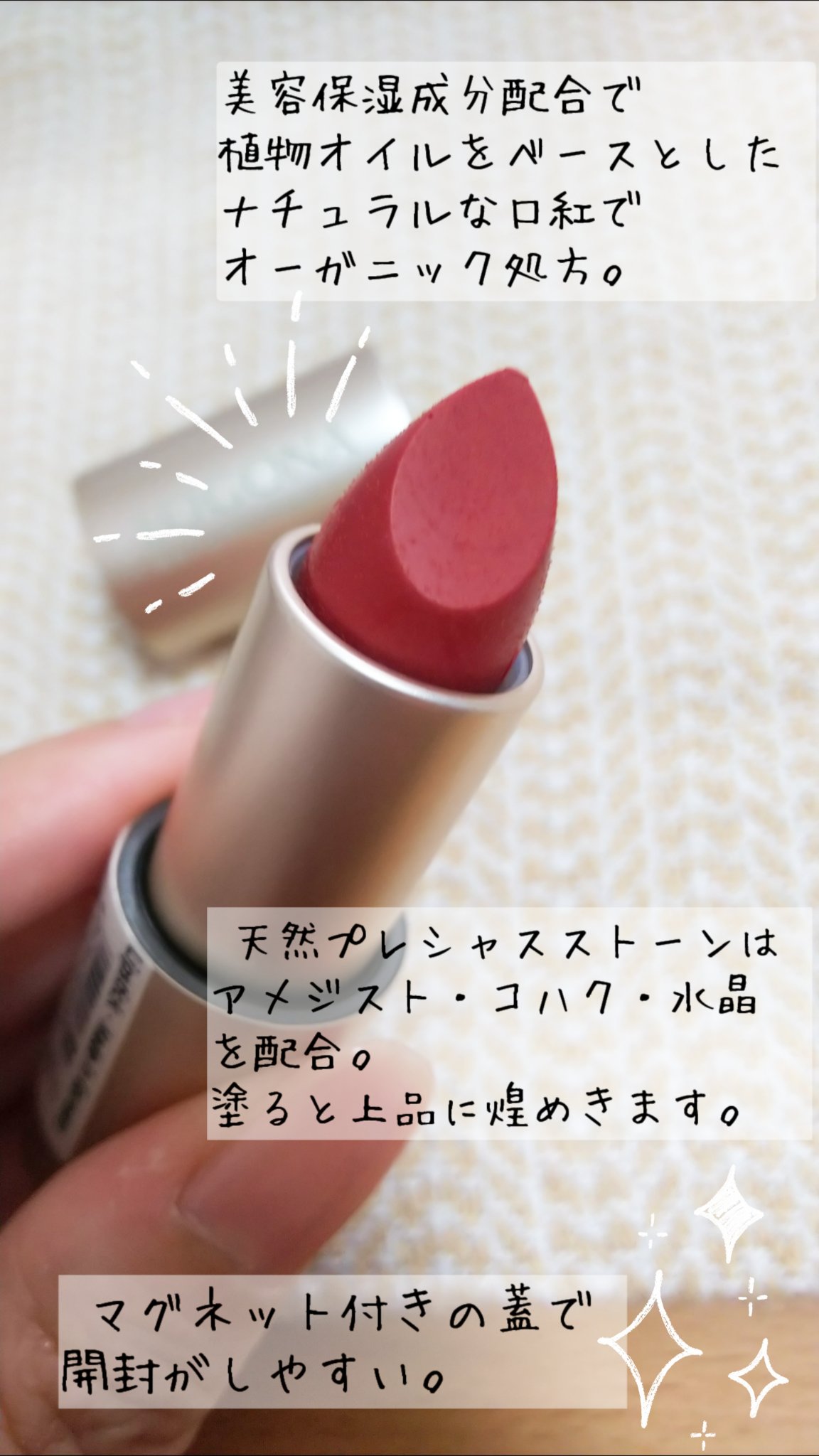 天然成分由来100% オーガニックのミツロウをたっぷり配合。乾燥が気になる唇にうるおいを与え、なめらか保ちます。 鮮やかなオレンジ色なのが印象的なリップスティック🧡 固めのスティックでスルスルと塗ることができ、ベタベタしないのにしっとりする✨ 保湿感もあり嬉しい使い心地でした☺️