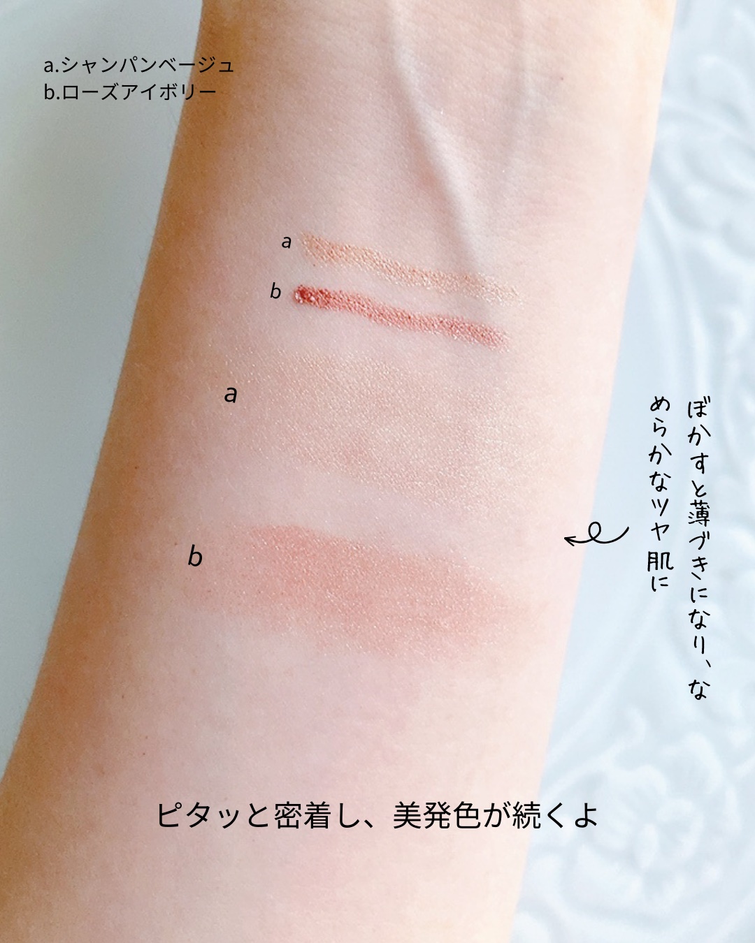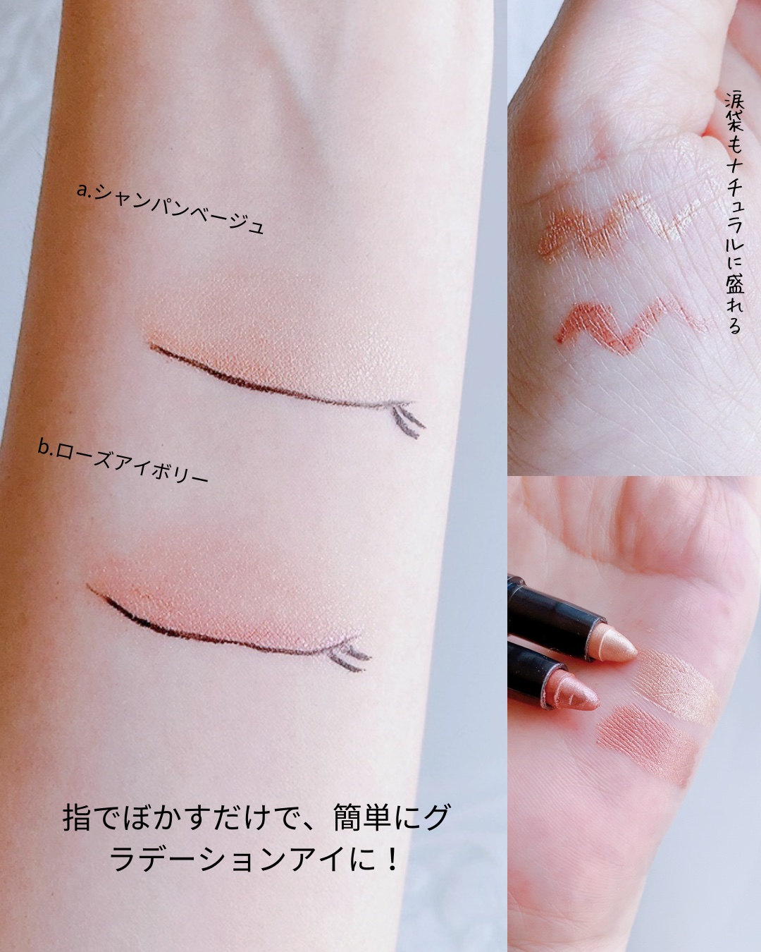 &beスティックアイシャドウ ¥2420新 2色 ナチュラルなのに華やかに仕上がるというデイリー使いにもイベントメイクにも最適なアイシャドウ!スティックタイプなのでメイク直し用としてもオススメ☆ そしてなんと言ってもこれ一本でメイクを仕上げるのをおすすめしたいくらいに上品に仕上がります😌💕 シャンパンベージュ洗練された印象のホワイトゴールド。肌や瞳に透明感をプラスしてくれて馴染み抜群。 ローズアイボリー彩度低めのローズベージュがとっても魅力的。深みのあるニュアンスで大人っぽい眼差しに。 アイシャドウとして使うだけでなく、アイライナーとしても使えるのでとにかく万能すぎる!
