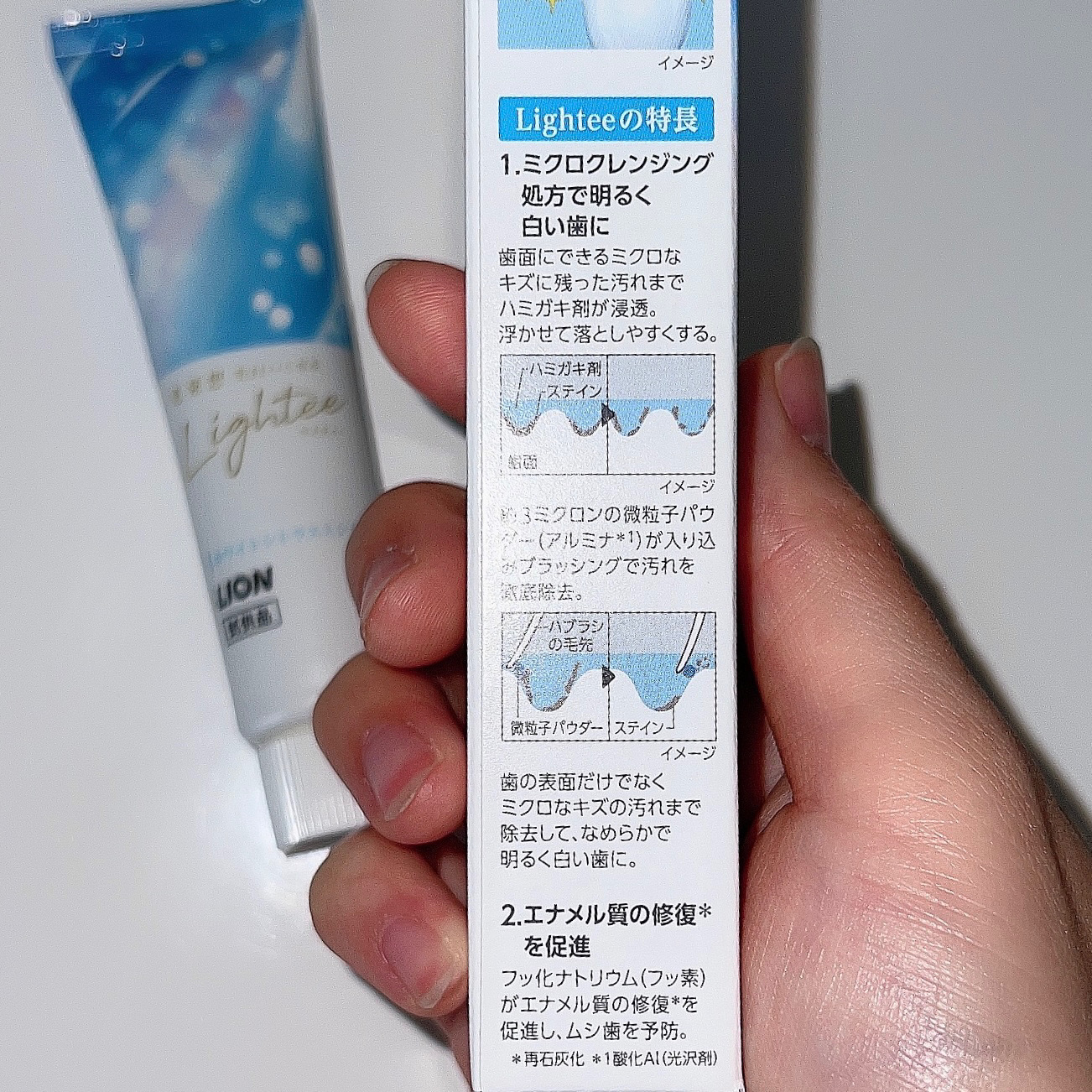 - ハミガキ売上金額No.1*1メーカーのライオンが本気で作った”光発想”の美白ハミガキ。 ミクロクレンジング処方で”光を反射する"明るく白い歯*2に導きます。 歯面にできるミクロなキズに残った汚れまでハミガキ剤が浸透。 ピロリン酸Na*3がそのキズに残った着色汚れを浮かせて落としやすくします。 そして約3ミクロンの微粒子パウダー*4が入りこみブラッシングで汚れを徹底除去。 「光を反射する」なめらかで明るく白い歯*2へ。 さらにエナメル質の修復*5を促進し、ムシ歯を予防します。 *1 2017年1月~2021年3月累計販売金額 インテージSRI+歯磨き市場 *2 本来の白い歯、*3ピロリン酸Na(清掃助剤)、*4 酸化Al(光沢剤)*5再石灰化