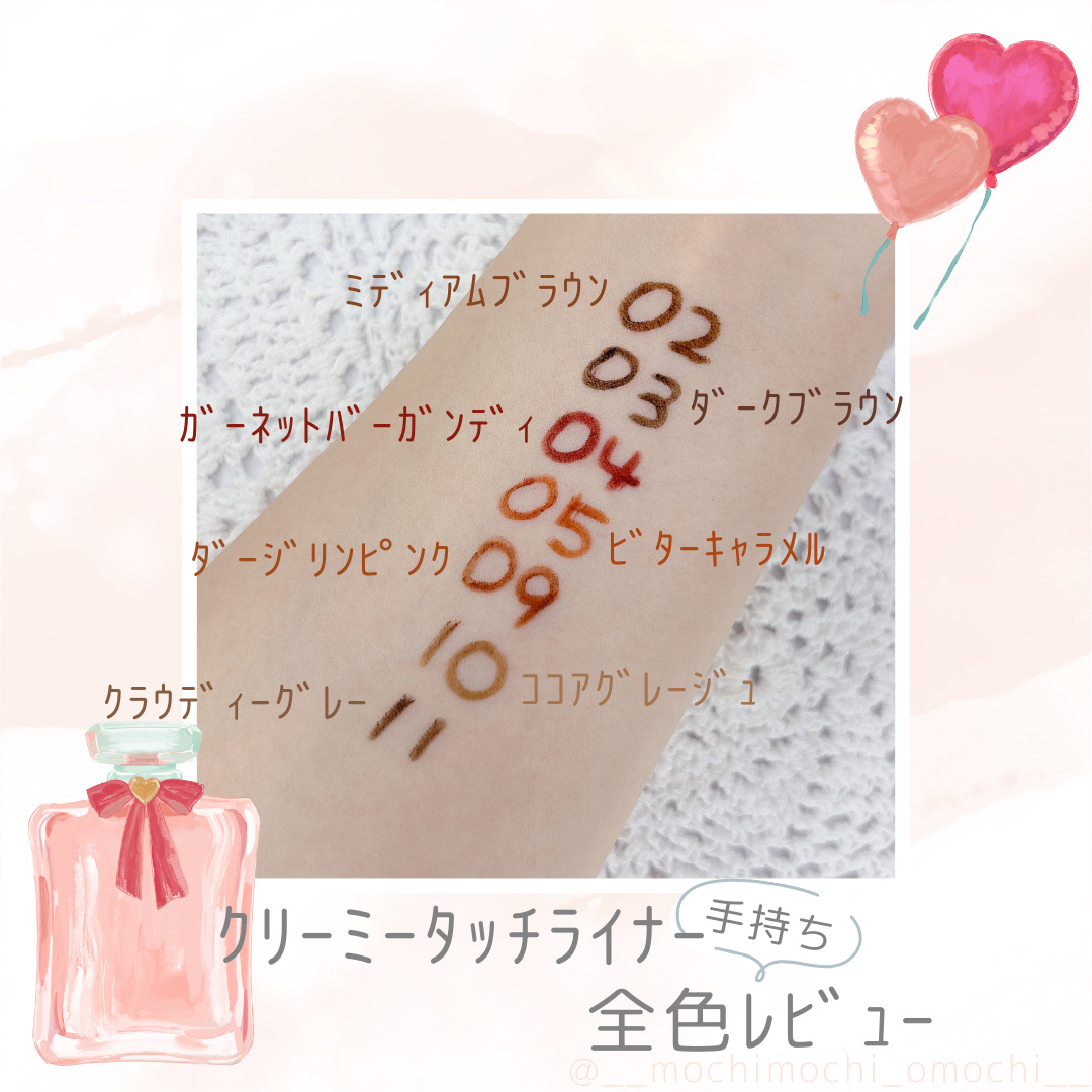 名前の通り黒。一番目元をくっきりさせたい時はこれ。 濃いブラウン。ブラウンで締めたい時はこれ。とはいえ、02を使うので使用率低め。 オレンジ🍊のようなキャラメルカラー。オレンジや黄味が強い時はこれを使います。 濃いめの紫。秋メイクでは出番が多い。 可愛すぎるピンク。ミルキーなピンクブラウンなナチュラルに可愛い。下瞼の粘膜はこれしか使ってないぐらい好き💕これも何本もリピ。 グレー。これも使いやすい!!上瞼は悩んだらこれを使っておけばなんとかなるカラー。黒のようにパキッとしすぎないので、自然に目力アップする😀 鮮やかなピンク。春夏にはぴったりのカラー😍 ミルキーコーラルのようなカラー。これも可愛い😍。アイラインとして線がパキッと出るわけではないので、ほんのり際に仕込んでます. 10より黄味がないので、ミルキーなカプチーノぽいカラーが本当に使いやすい。最近はこれが一番好き💕そして1番出番が多い。