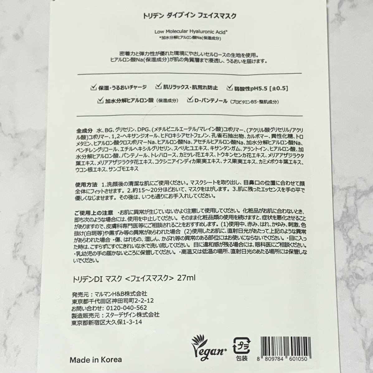 - <1枚> 水、BG、グリセリン、DPG、(メチルビニルエーテル/マレイン酸)コポリマー、(アクリル酸グリセリル/アクリル酸)コポリマー、1,2-ヘキサンジオール、ヒドロキシアセトフェノン、孔雀石抽出物、カルボマー、異性化糖、トロメタミン、ヒアルロン酸クロスポリマーNa、ヒアルロン酸Na、アセチルヒアルロン酸Na、加水分解ヒアルロン酸Na、ペンチレングリコール、エチルヘキシルグリセリン、スベリヒユエキス、キサンタンガム、アラントイン、ヒアルロン酸、加水分解ヒアルロン酸、パンテノール、トレハロース、カミツレ花エキス、トウキンセンカ花エキス、メリアアザジラクタ葉エキス、メリアアザジラクタ花エキス、コクシニアインディカ果実エキス、ナス果実エキス、カミメボウキ葉エキス、ウコン根エキス、サンゴモエキス <3枚> 水、BG、グリセリン、DPG、(メチルビニルエーテル/マレイン酸)コポリマー、(アクリル酸グリセリル/アクリル酸)コポリマー、1,2-ヘキサンジオール、ヒドロキシアセトフェノン、乳雀石抽出物、カルボマー、異性化糖、トロメタミン、ヒアルロン酸クロスポリマーNa、ヒアルロン酸Na、アセチルヒアルロン酸Na、加水分解ヒアルロン酸Na、ペンチレングリコール、エチルヘキシルグリセリン、スベリヒユエキス、キサンタンガム、アラントイン、ヒアルロン酸、加水分解ヒアルロン酸、パンテノール、トレハロース、カミツレ花エキス、トウキンセンカ花エキス、メリアアザジラクタ葉エキス、メリアアザジラクタ花エキス、コクシニアインディカ果実エキス、ナス果実エキス、カミメボウキ葉エキス、ウコン根エキス、サンゴモエキス <10枚> 水、BG、グリセリン、DPG、(メチルビニルエーテル/マレイン酸)コポリマー、(アクリル酸グリセリル/アクリル酸)コポリマー、1,2-ヘキサンジオール、ヒドロキシアセトフェノン、孔雀石抽出物、カルボマー、異性化糖、トロメタミン、ヒアルロン酸クロスポリマーNa、ヒアルロン酸Na、アセチルヒアルロン酸Na、加水分解ヒアルロン酸Na、ペンチレングリコール、エチルヘキシルグリセリン、スベリヒユエキス、キサンタンガム、アラントイン、ヒアルロン酸、加水分解ヒアルロン酸、パンテノール、トレハロース、カミツレ花エキス、トウキンセンカ花エキス、メリアアザジラクタ葉エキス、メリアアザジラクタ花エキス、コクシニアインディカ果実エキス、ナス果実エキス、カミメボウキ葉エキス、ウコン根エキス、サンゴモエキス
