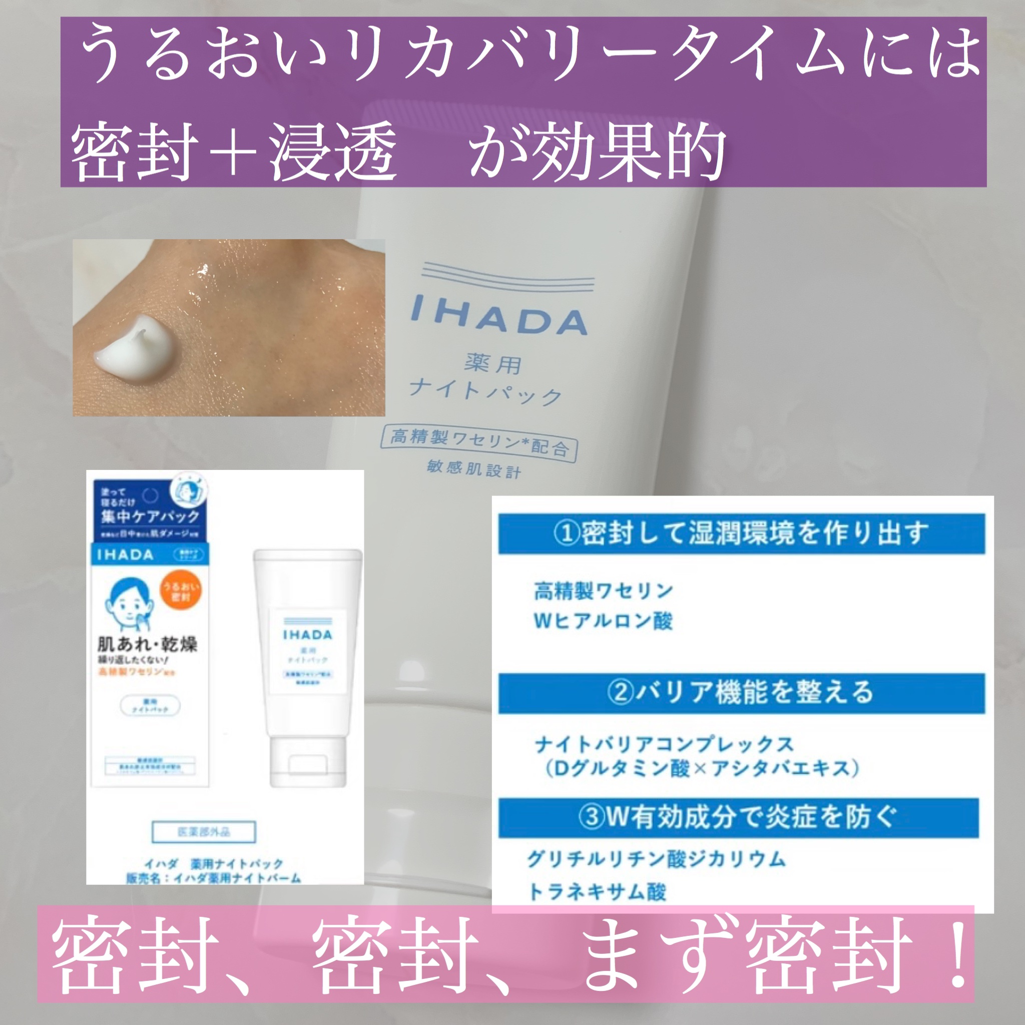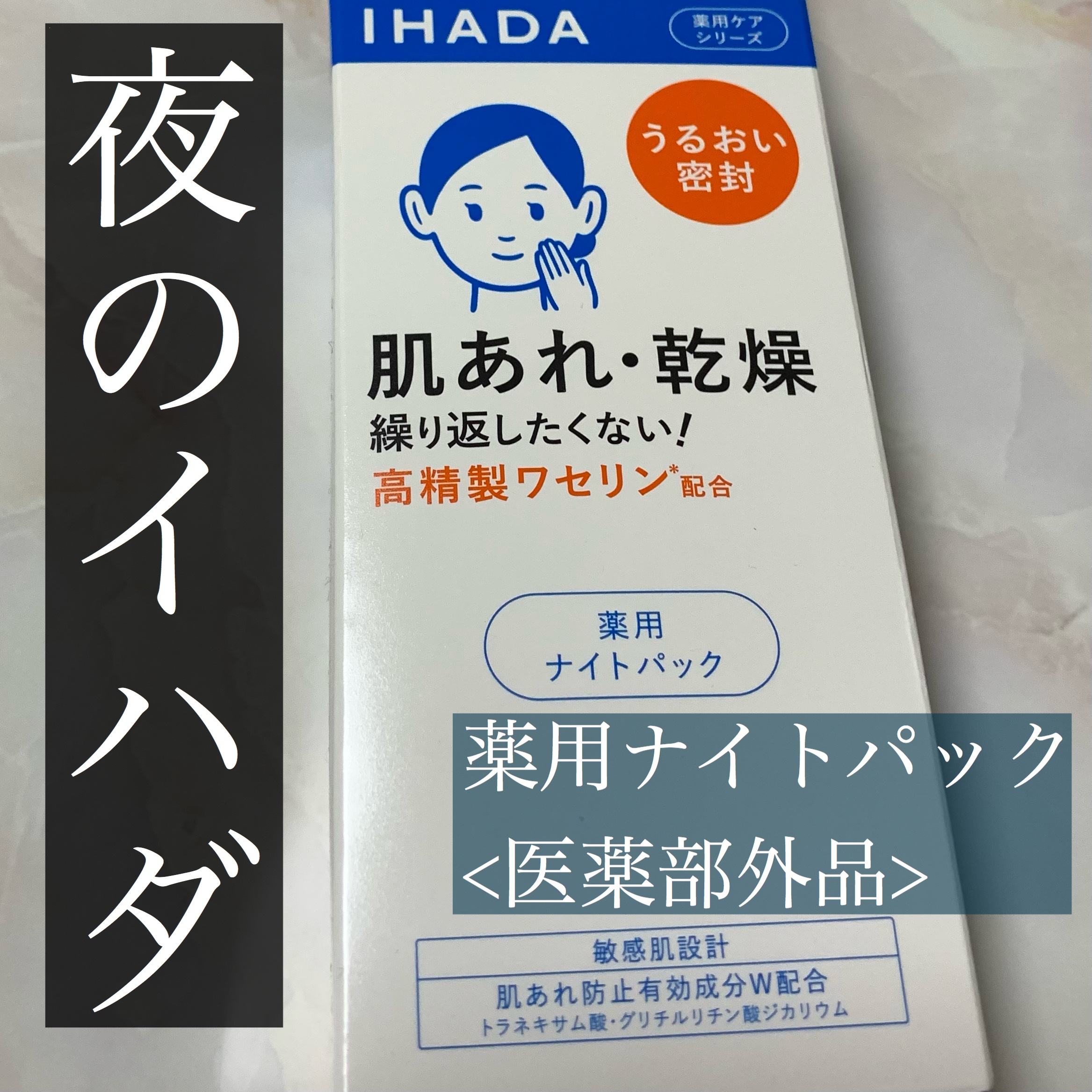 - 【医薬部外品】 新パッケージへリニューアル。 繰り返しがちな肌荒れ・乾燥を防ぐ、夜の集中ケアパックです。 やさしく肌に広がるクリーミーなバームのパックで、べたつかずに一晩中密封してうるおいが続き、翌朝なめらかな肌に整えます。 クリームのなめらかさとバームの密封力を実現したハイブリッドケア処方。 蓄積した、乾燥など日中に受けた肌ダメージ対策に、塗って寝るだけの簡単ケア。 2つの肌荒れ防止有効成分:トラネキサム酸、グリチルリチン酸ジカリウム配合 肌うるおいバリア保護成分:高精製ワセリン配合 うるおいバリア機能を整えながら、角層のすみずみまでうるおいで満たし、すこやかな環境に導きます。 敏感肌設計 ○厳選原料・成分配合 ○パラベン(防腐剤)無添加、アルコール(エチルアルコール)無添加 ○無香料、無着色、弱酸性〇アレルギーテスト済み・ニキビのもとになりにくい処方(全てのかたにアレルギーが起きない、また、ニキビができないわけではありません。) 販売名:イハダ 薬用ナイトバーム ※商品の改良や表示方法の変更などにより、実際の成分と一部異なる場合があります。実際の成分は商品の表示をご覧ください。