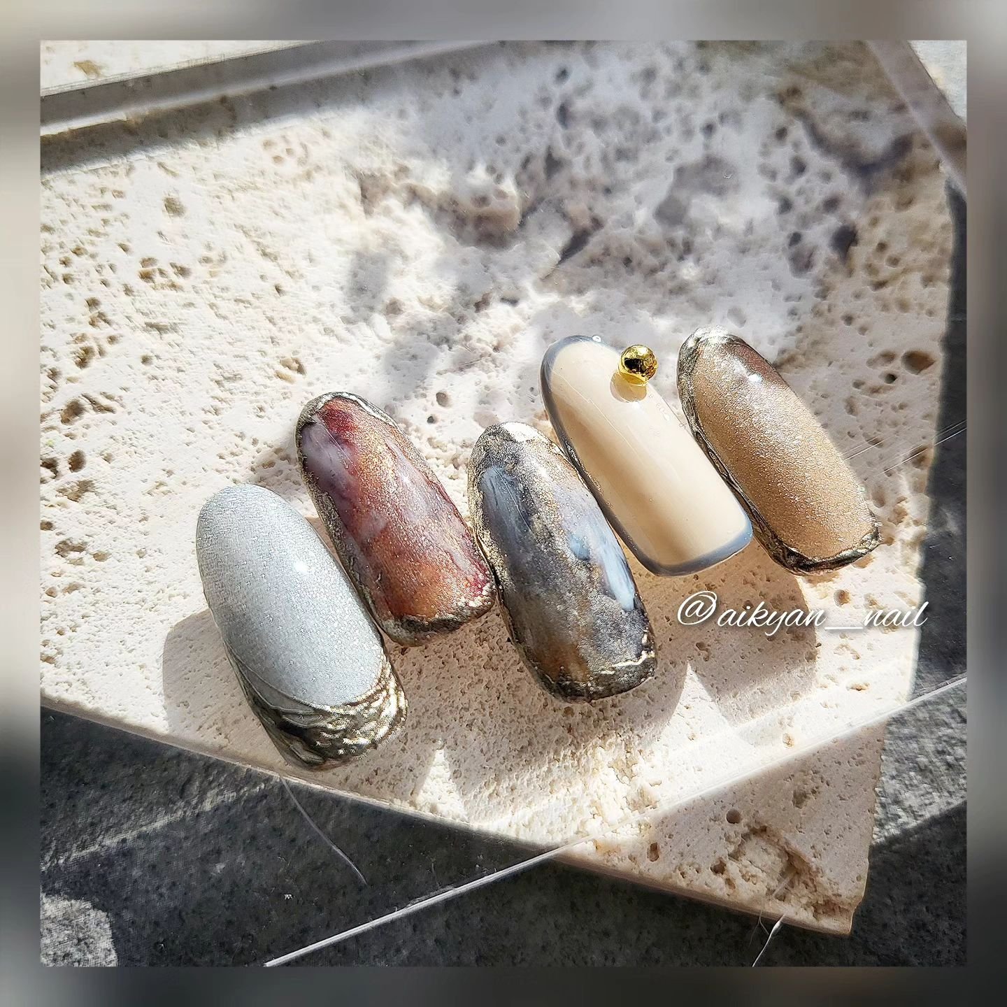 ❥こんばんわっ𓂅꙳𖤐セルフネイラーの@au_nailです♡大好きなohoraのネイルシールで秋ネイル仕様です🍂💅マグネットを主張したかったのでマグネットメインで貼り付けました✌️親指のデザインも可愛いけど人差し指〜小指までのデザインも可...