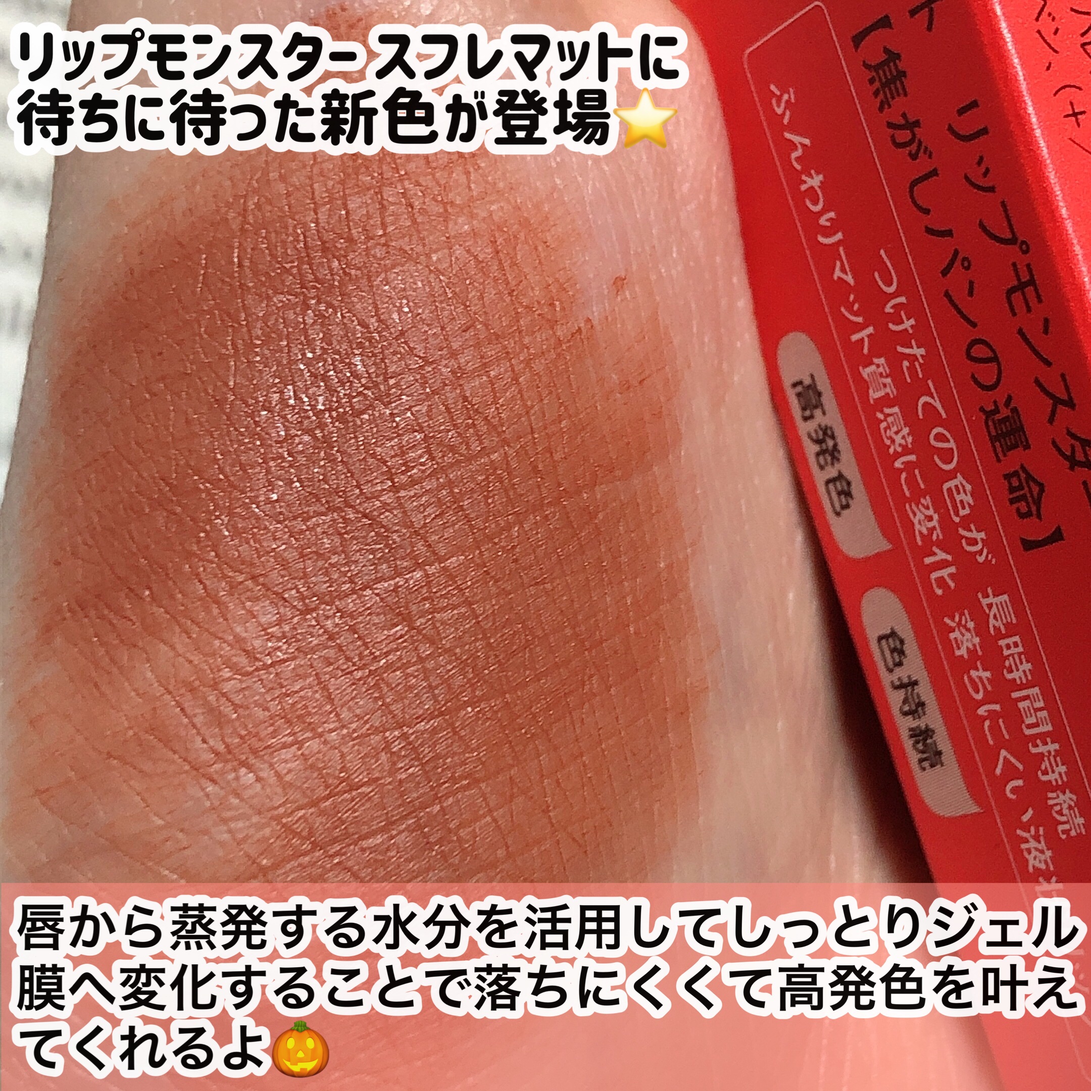 - つけたての色が長時間持続 ふんわりマット質感に変化 落ちにくい液状リップ ■高発色スフレ処方:唇から蒸発する水分を活用してしっとりジェル膜へ変化 液状リップの油分が揮発してふんわりマット質感に変化 ■リップモンスターの機能を踏襲 つけたそのままの色が長時間持続 マスクをしても色落ちしにくい 飲み物を飲んでもカップにつきにくい