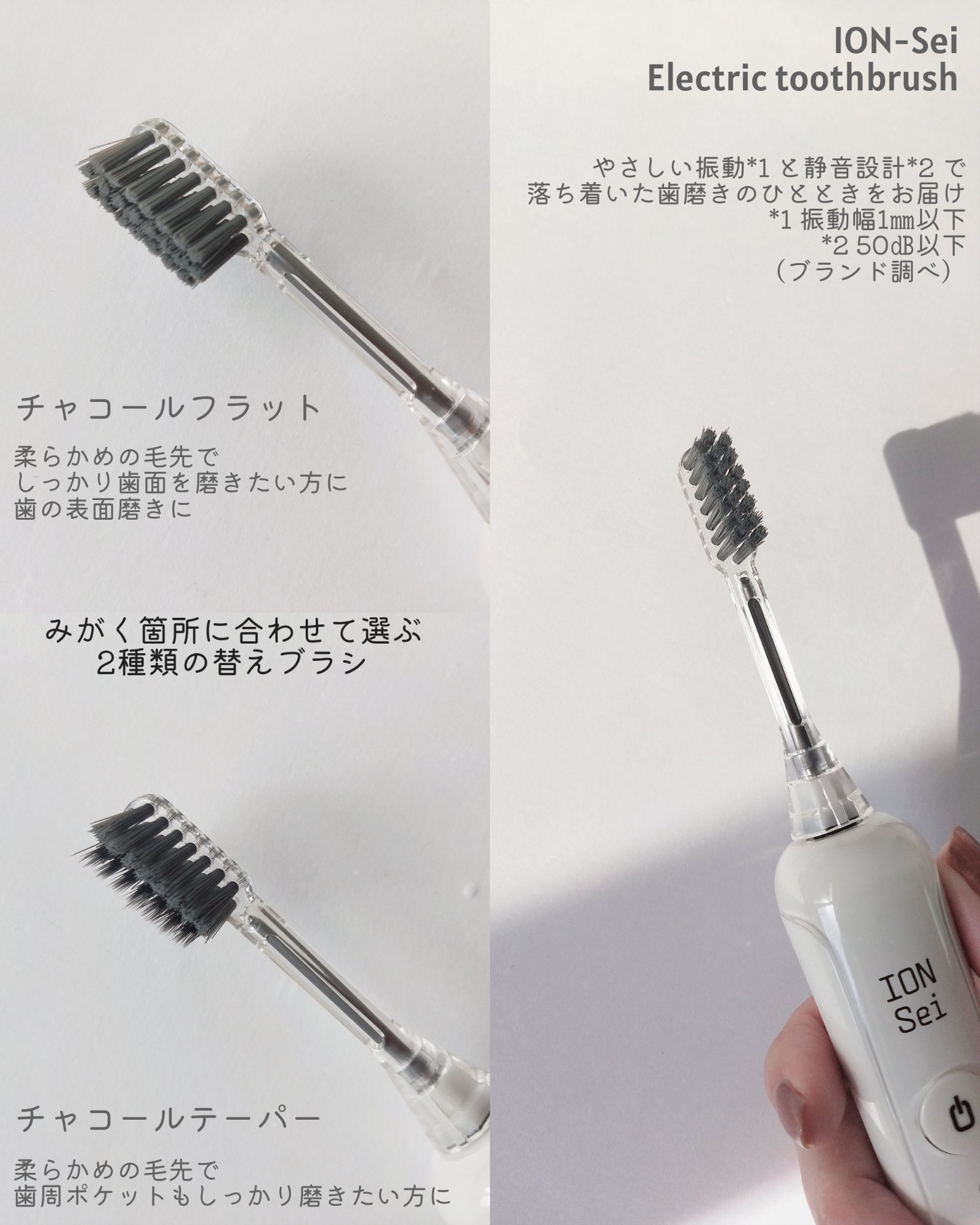 力は全く入れずに歯にブラシを当てるだけで歯垢を落とせて口内を清潔に保てます。 振動の幅は1mm以下だそう。普段の歯磨きがどれだけ力強かったか反省しました。 さらに二酸化チタンの光触媒効果で効果的なブラッシングに✨ 強さは3段階。真ん中が1番心地よい❤️ 2分で止まるように設計されていて、30秒ごとに一時停止します。 ブラシで磨くというより、ブラシを歯に当てるだけで充分です。 気持ちいいし、お口のネバネバや口臭がやわらいだと感じました。