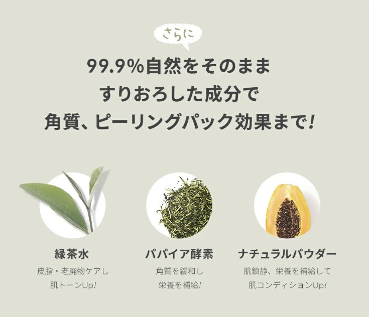 - <150ml> グリセリン、チャ葉エキス、ミリスチン酸、B G、ステアリン酸、ラウリン酸、水酸化K、水、ジステアリン酸グリコール、オレンジ果皮油、ケイソウ土、ステアリン酸グリセリル、オリーブ油脂肪酸ソルビタン、コーンスターチ、カオリン、ミツロウ、ラベンダー油、カプリリルグリコール、PCA-Na、リョクトウ種子、マグワ根皮エキス、炭酸水素Na、オリーブ果実油、ローマカミツレ花、クロレラ、ティーツリー葉油、デシルグルコシド、チャ葉、レモン果実エキス、カンゾウ根エキス、パパイア果実エキス、1 ,2 - ヘキサンジオール、サボンソウ葉エキス、コメヌカエキス、オタネニンジン根エキス、リョクトウ種子エキス、レタス葉エキス、ヒアルロン酸Na、スベリヒユエキス、アロエベラ葉エキス、ペンチレングリコール、エチルヘキシルグリセリン、ヤマノイモ根エキス