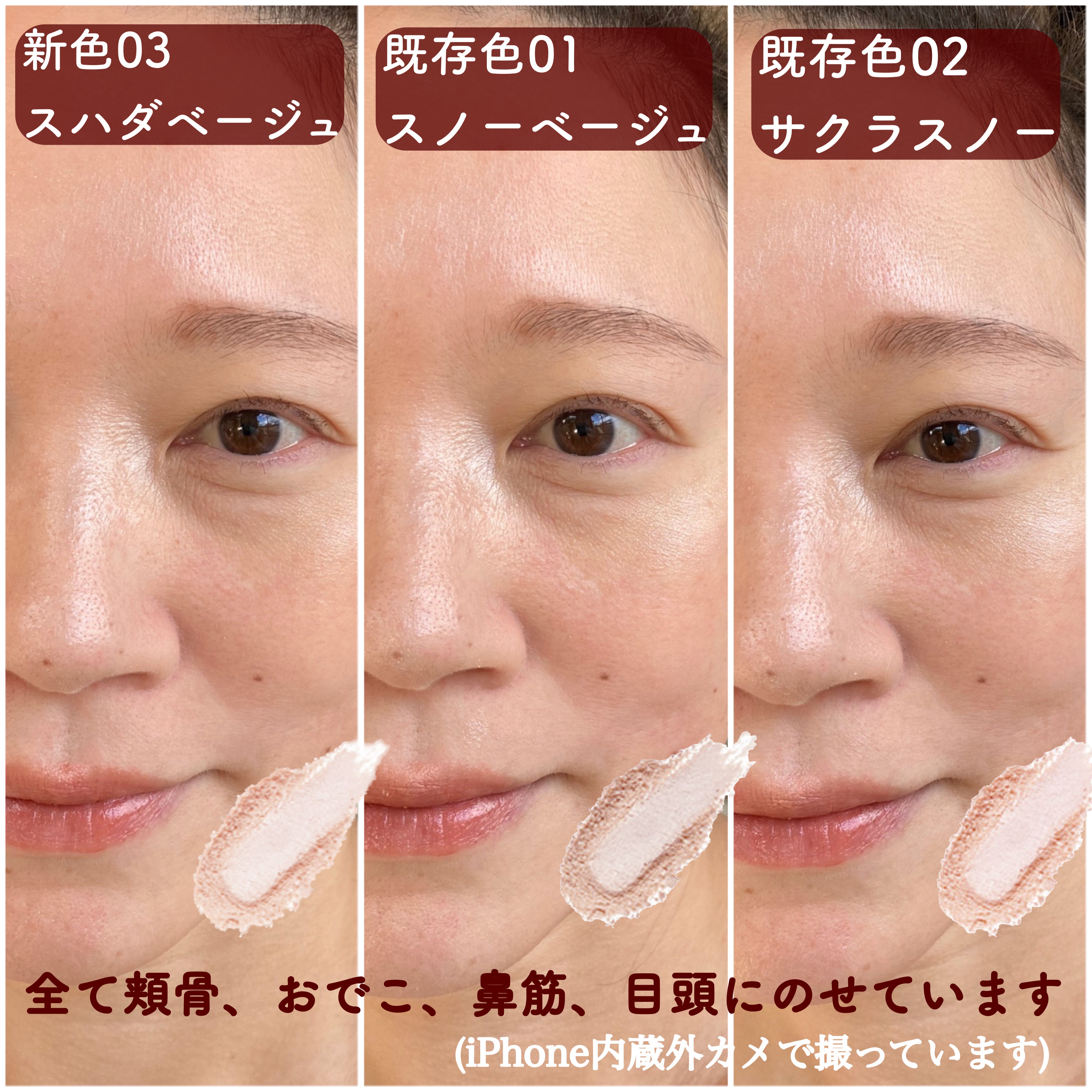 粉質はしっとりしていて粉飛びも無く、色味もイエローベージュにほんのりピンクが見えるようなニュートラルな明るいベージュに フェイスパウダーをつけた後のような乾燥も無く、皮脂で鼻がテカテカしてもある程度ハイライトが残っていたので 粉質もコスパも良かったので他の色にも挑戦してみたいです( 'ω')/