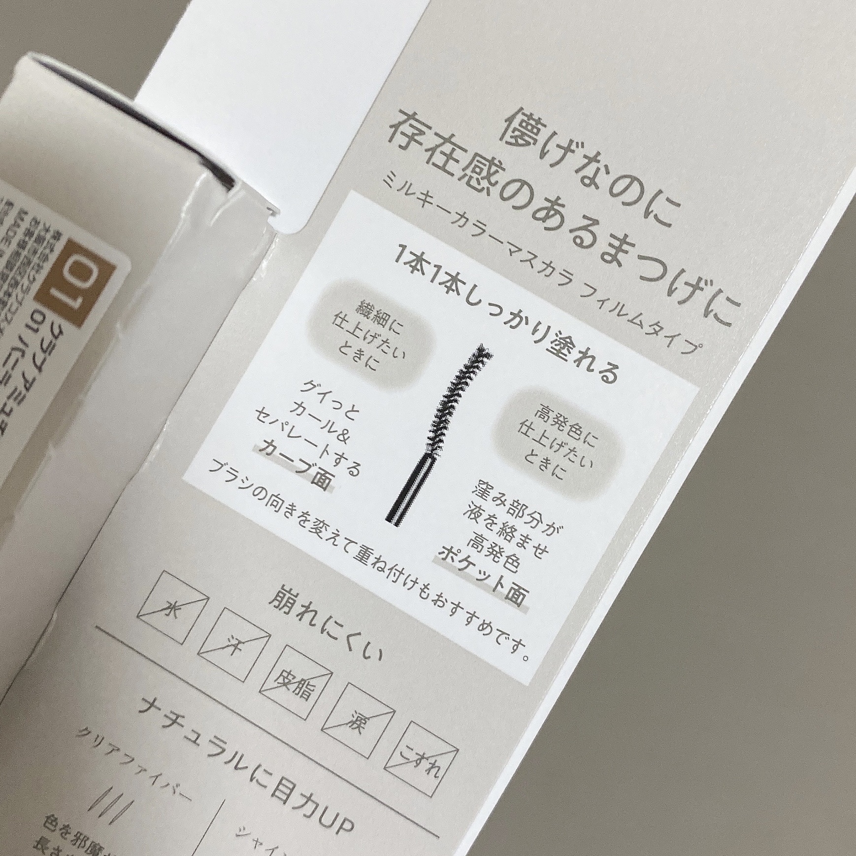 - パール&ファイバー配合のひと塗りで高発色が持続するフィルムタイプマスカラです。ミルキーカラーが目元を印象的に見せ、まつげ1本1本がセパレートされた美しいまつげに仕上がります。全4色。