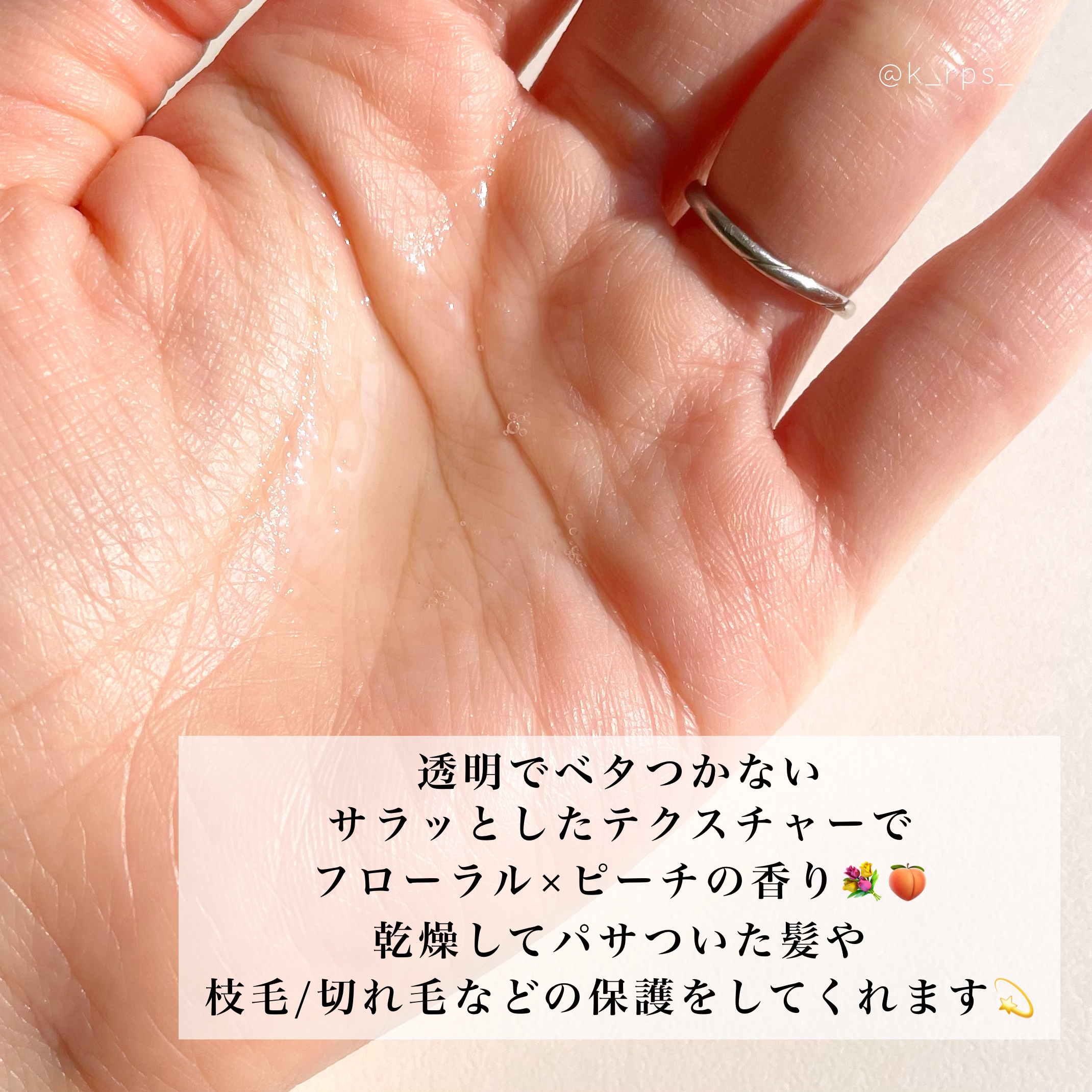 - 自然由来のオイル配合で、髪のダメージを補修&潤いを与える軽い付け心地のヘアセラム。 フローラルピーチの香り。
