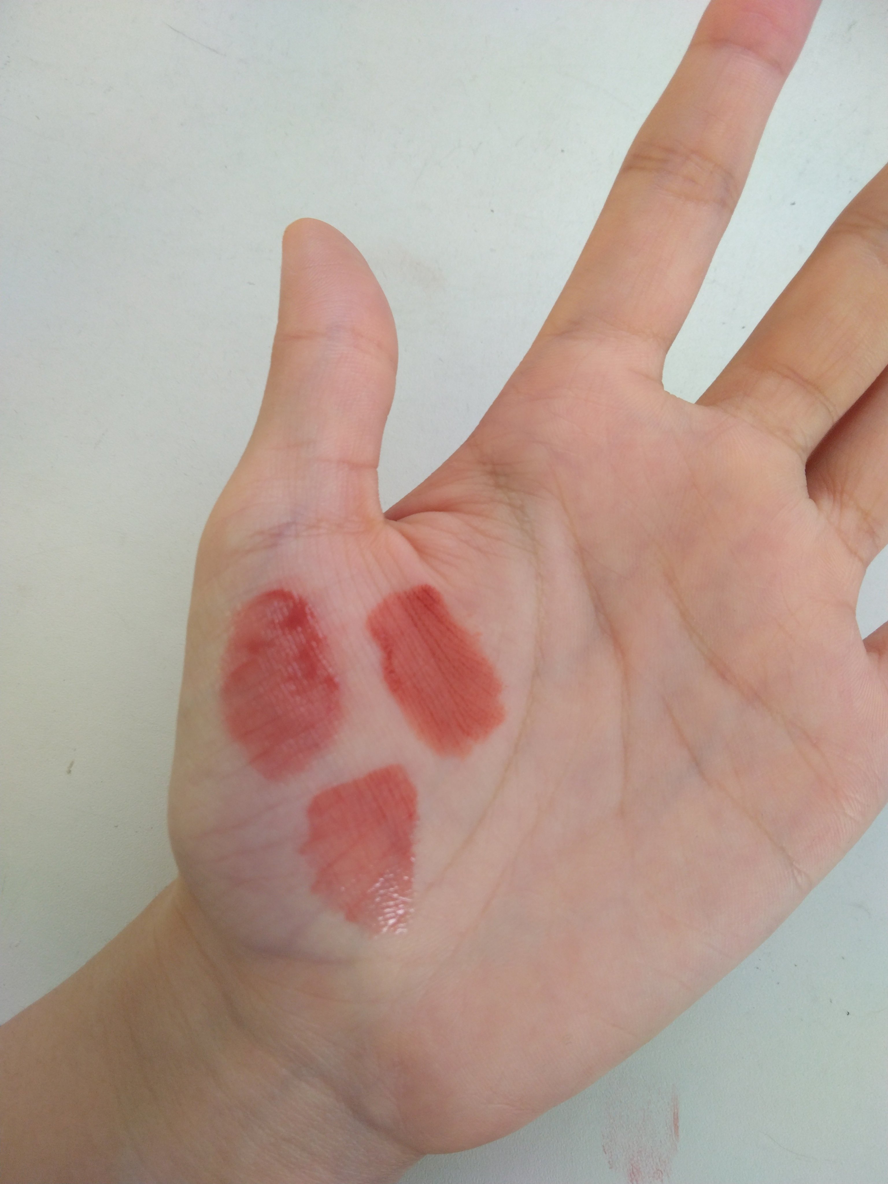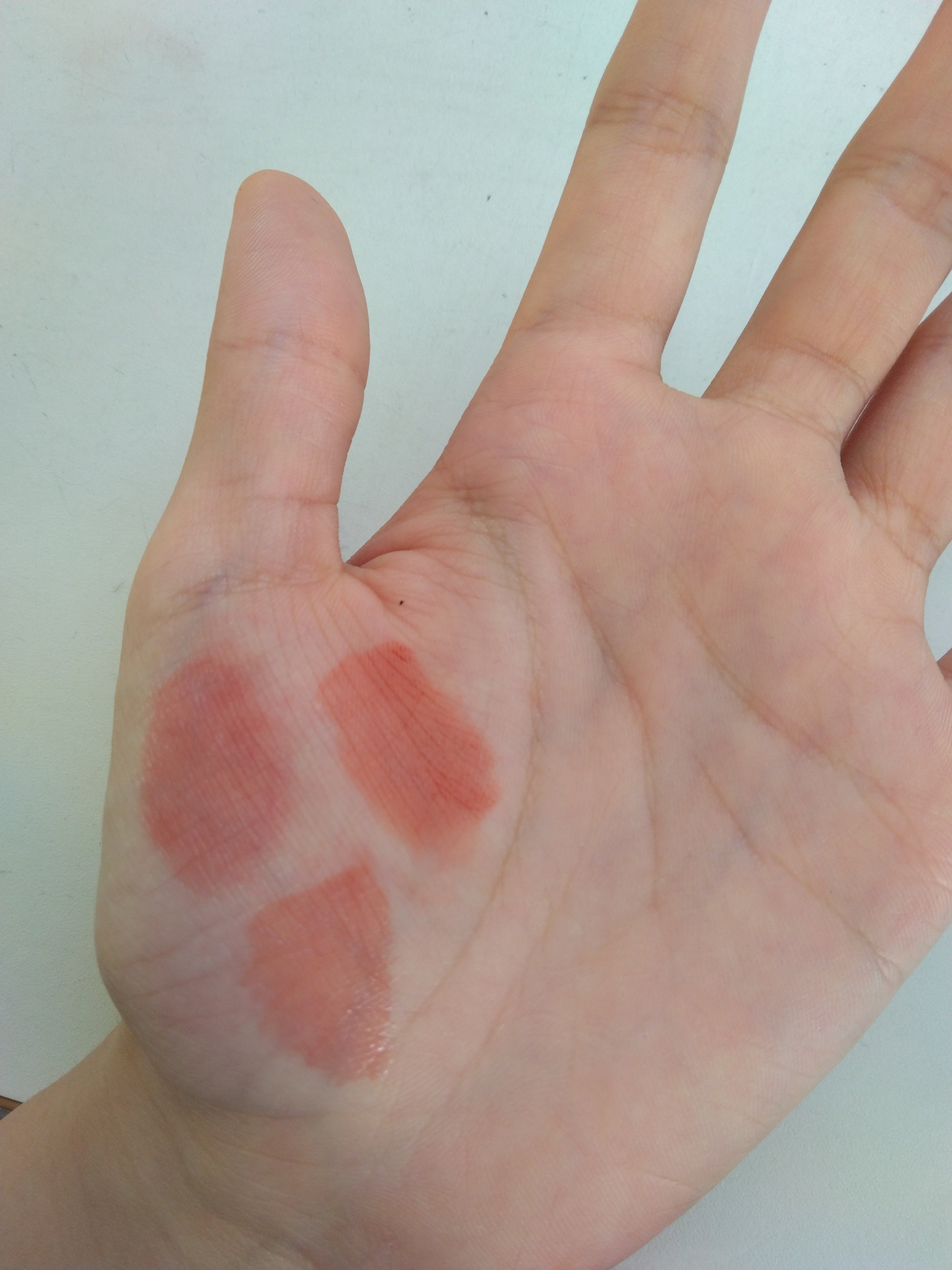 まず自分に合うリップ/アイシャドウを唇全体、アイホール全体に薄く塗る ・塗りたいリップを下唇の内側だけに塗る(これも薄く!!!) ・下唇についたリップを上唇につけるようにんまんまする ・ティッシュオフ ・塗りたいアイシャドウ(ラメ系のほうがいいです!マットだとただ色が混ざるだけになるので)を薄ーくぽんぽんするようにつける 私は特に写真の3つが合わなくて、でもピンクアイシャドウ使いたいし鮮やかオレンジのリップも使いたいし、、、という感じです笑