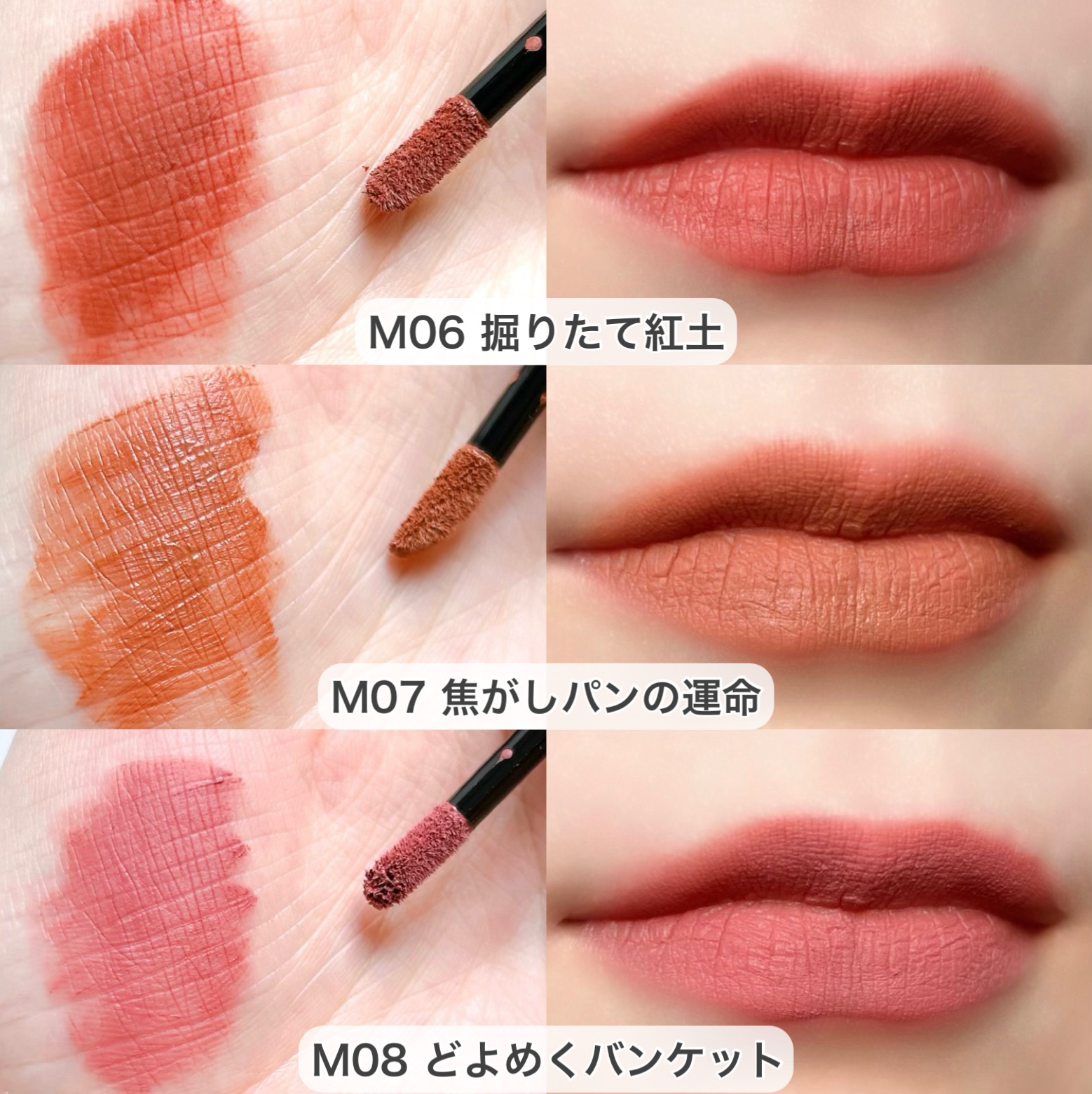 新色は大人かわいい上品な2つのカラー❤️ 06 #ピンクベージュ ナチュラルでどんな場面にも合うような万能なカラー✨ 上品な印象になる仕上がりです💖 07 #ビターレッド 深みのある大人っぽいカラー✨ 華やかな印象になる仕上がりです💖 01 #ナチュラルピンク 女性らしい華やかな印象になるピンク 02 #コーラルレッド 垢抜けたおしゃれな印象になるコーラルレッド 03 #ベージュブラウン 知的で大人っぽい印象になるベージュブラウン 04 #キャメルオレンジ こなれた印象になるオレンジ 05 #プラムレッド 洗練された印象になる青みレッド 色持ちも良くて、ティッシュオフするとマスクにもつきにくくておすすめリップです😊