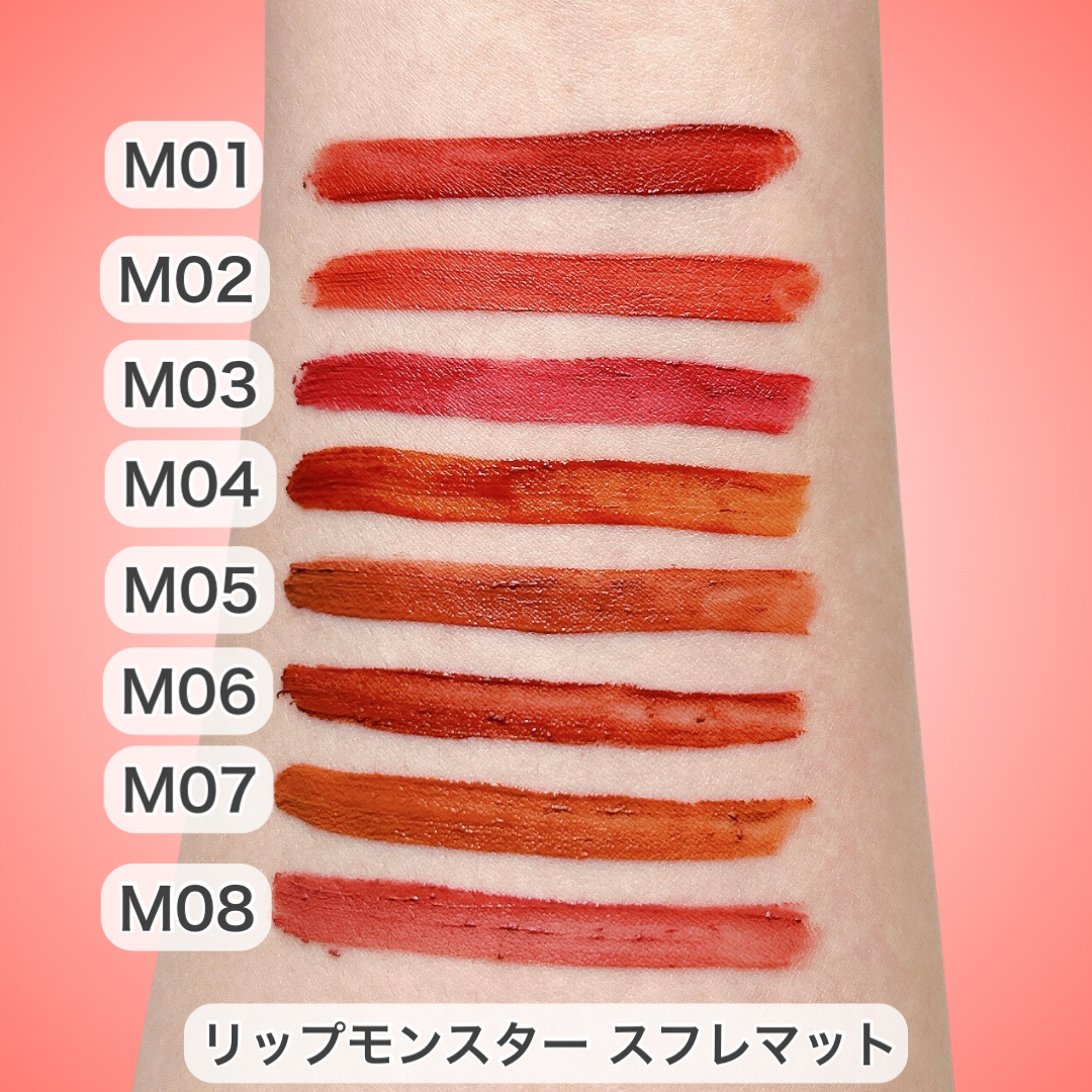 #提供❁.˚‧º‧‧º·˚.❁ リプモン スフレマット 4色スウォッチ❁.˚‧º‧‧º·˚.❁KATEリップモンスタースフレマットをお試し✧*˚₊‧ੈ✩おすすめポイントੈ✩‧₊˚*⋆つけたての色が長時間持続⋆ふんわりマット質感に変化する落...
