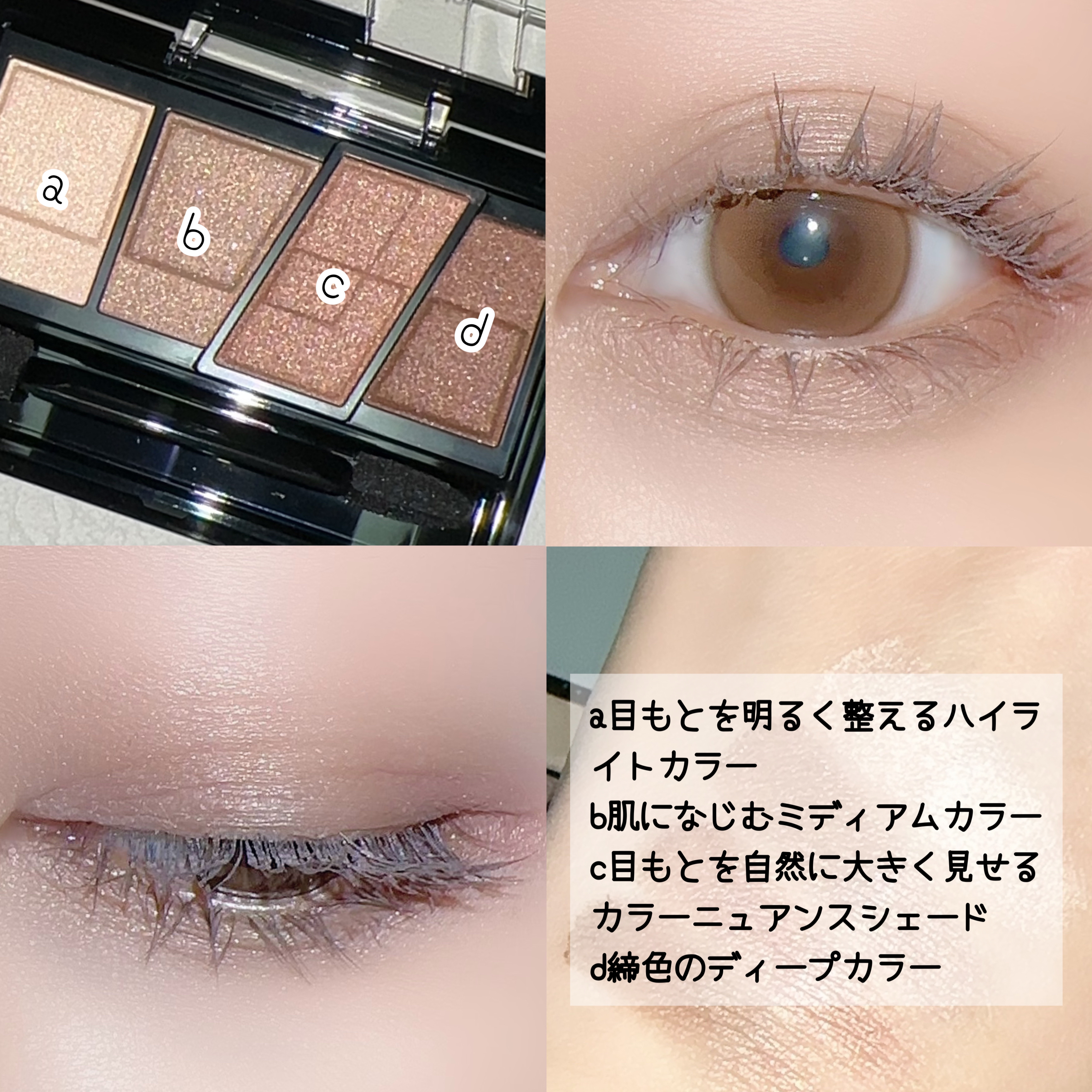 - カラーニュアンスシェードを目尻に入れるだけで目幅を大きく見せ※、抜け感のある明るい大きな目元に仕上るブラウンアイシャドウ。 ブラウン×カラーニュアンスの4色セット。※メイクアップ効果