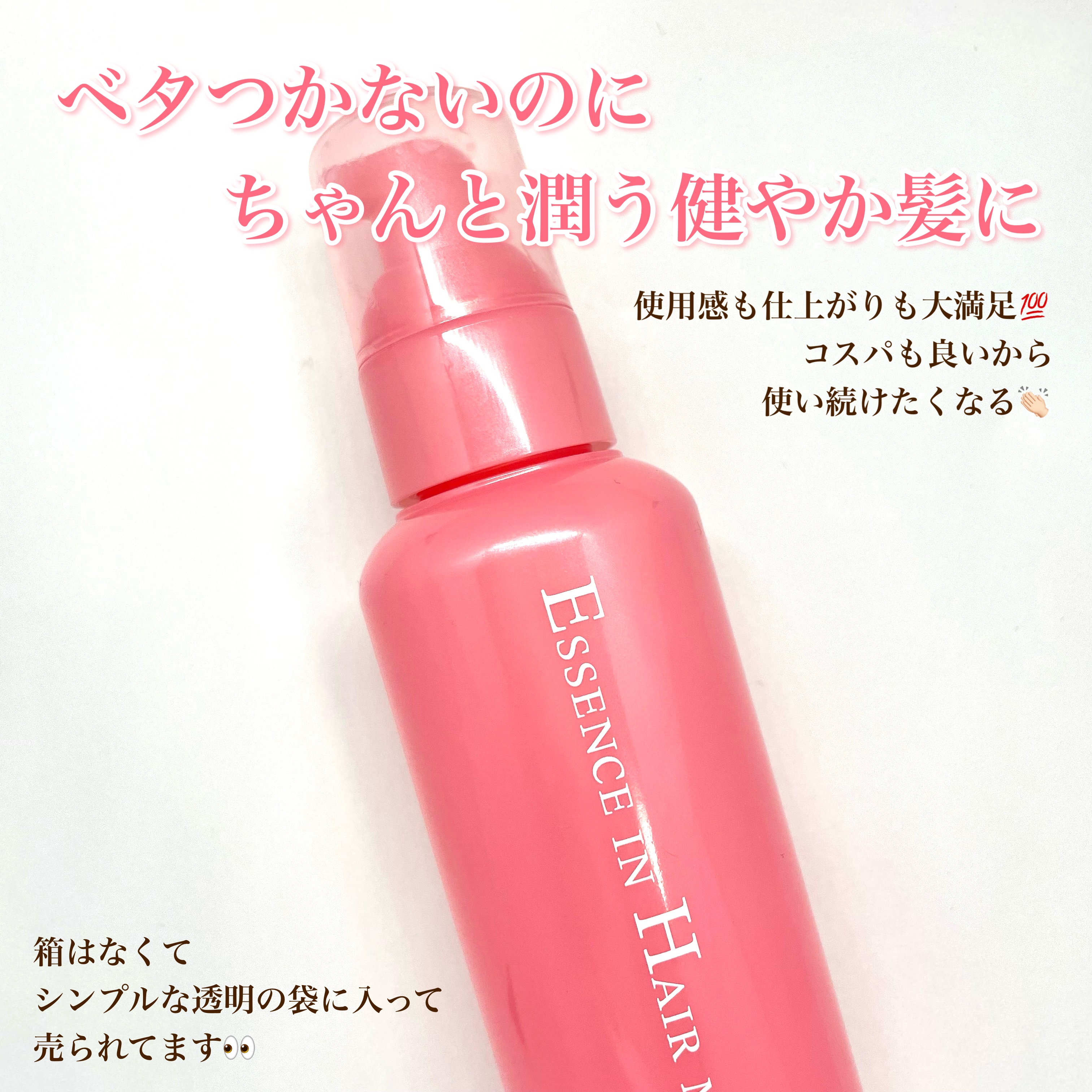 - パサつき、広がり、枝毛、ツヤ不足・・・髪のお悩みは尽きないもの。 エッセンスインヘアミルクは、そんな乾燥によるお悩みにアプローチする洗い流さないタイプのトリートメントです。 サロン業界注目の美髪成分「CMC」を配合。この「CMC」は、髪内部の成分が流れ出るのを防ぐ重要な保湿成分で、一度「CMC」を失うと自ら作り出すことはできないので、補うケアが不可欠なのです。 使用方法は簡単。適量を手にとって、タオルドライ後の髪(または乾いた髪)に、毛先を中心になじませます。 ドライヤーの熱を味方にして、サラサラつるんの指通りを実現します。 さらに高保水ミルクが、うるおいを逃がさないように髪表面をコート。内外からのしっかりケアで、うるおい艶美髪をずっとキープします。 ●無香料、無着色 ●酸化しやすい油分不使用●浸透美容液成分配合=CMC類似成分、11種のアミノ酸をブレンドした毛髪補修成分●高保水ミルク配合=保水効果の高い毛髪保護成分●ヒートプロテイン配合=毛髪保護成分●シャイニーグロス成分配合=ツヤ成分●アルコールフリー ※アレルギーテスト済=全ての方にアレルギーが起こらないということではありません。