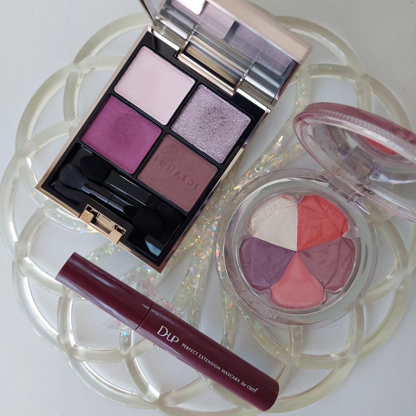RMKのアイシャドウはこれがデビュー。こんなんブルベホイホイじゃん…。かわいすぎて即予約電話したわ🫠🩷 青みピンクに透明感爆発パープルにキラキララメ。締め色はグレージュっぽいブラウン。ブルベ大歓喜。 発色は調整しやすい。ピンクも見た目はビビッドだけど、ふんわり色づくので、好みの濃さにできるよ。