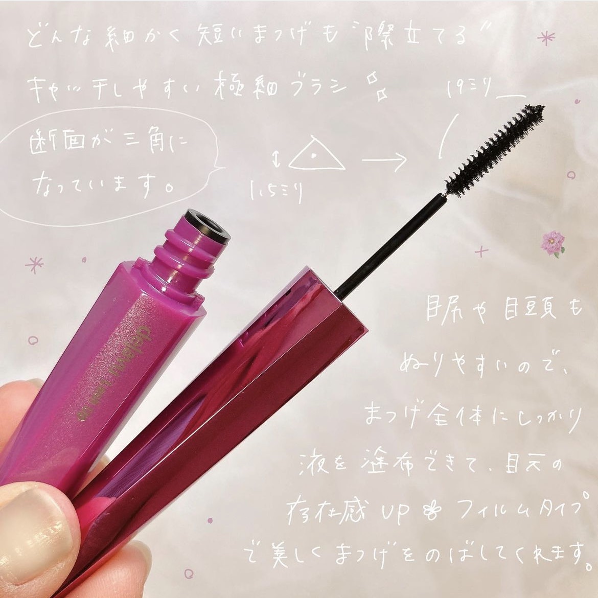 - ロングでもボリュームでもない、「自まつげを際立てる」という新発想 “見えないまつげ”も1本残らず際立てて、目ヂカラを最大限に引き出す 1.うぶ毛レベルの“見えないまつげ”も際立てる「高密着フィルム」 2.あらゆるまつげも1本残らず際立てる「超極細三角ブラシ」