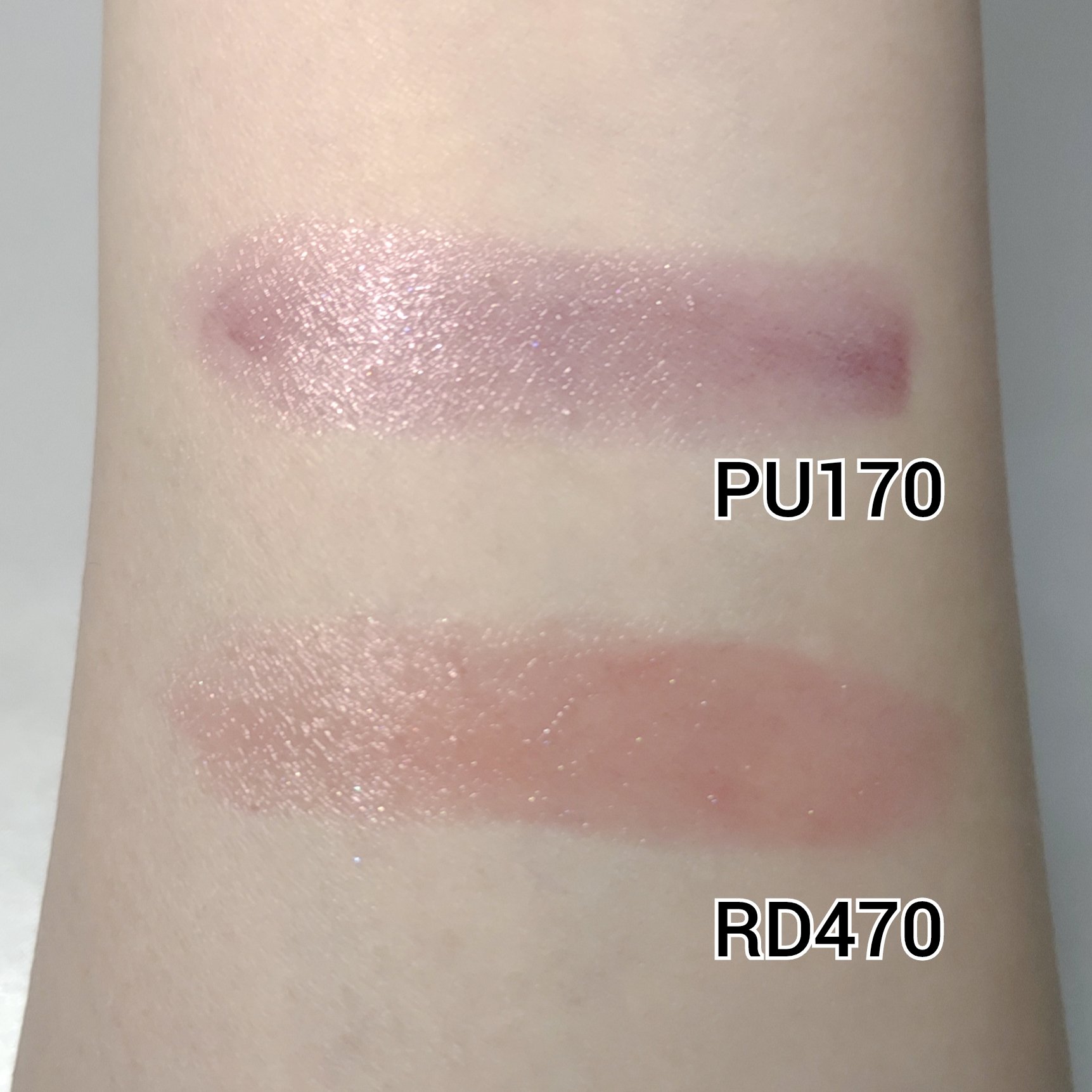 唇をケアしながら、シアーな発色でほんのり色味をプラス とろけるような塗り心地と、しっとりとした仕上がりを叶える PU170の方は塗り重ねると結構深みのあるカシス色になるため、パーソナルカラー冬秋ディープの私にはバッチリでした。 RD470は肌馴染みがよいレッドで、塗り重ねても暗くはならずに色が濃くなります。ほどよい黄みもあるので、ぐりぐり濃く塗っても派手になりませんでした。 実物は写真よりキラッキラです✨