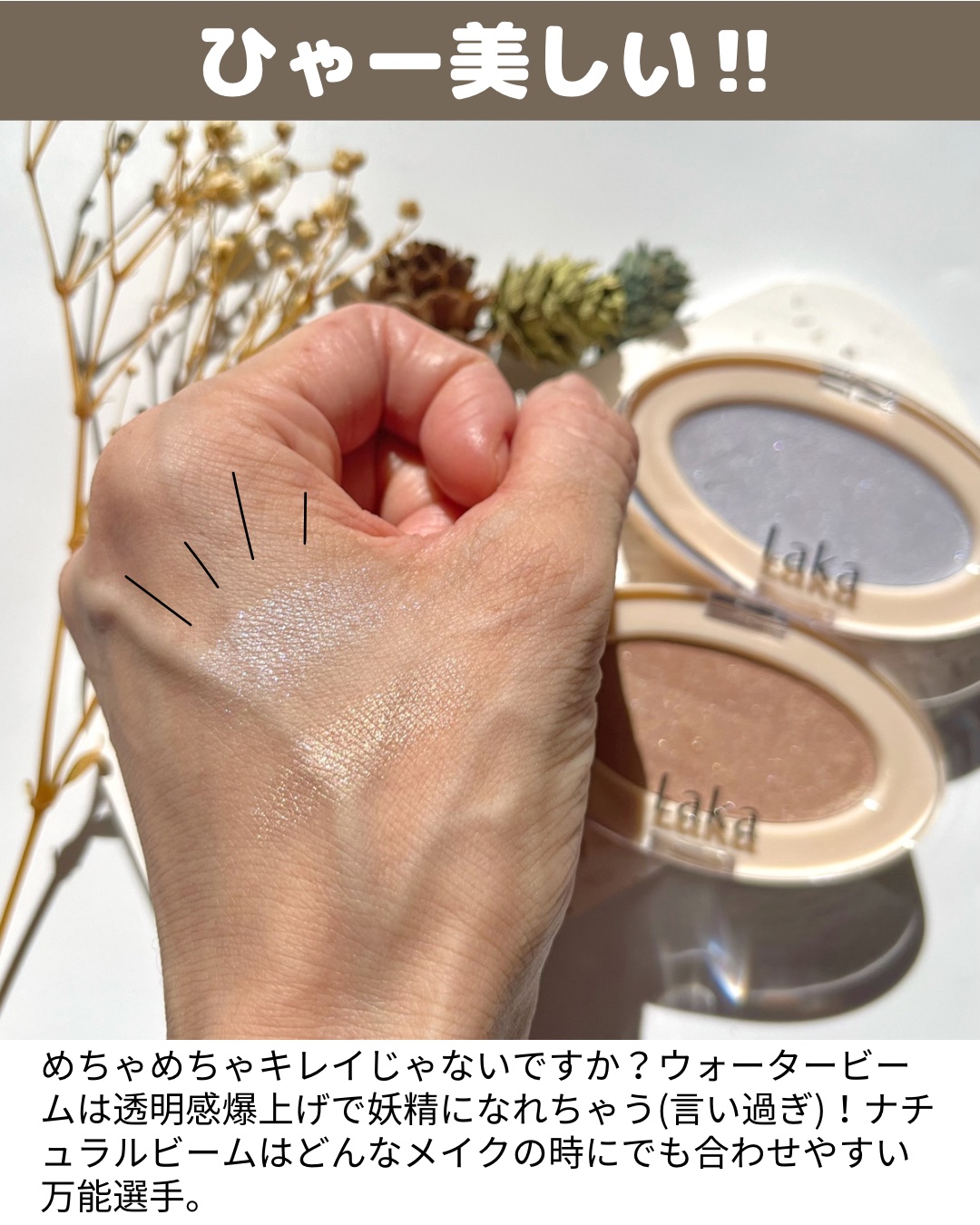 Laka ドリームビームハイライター 03ウォータービームです!キャンメイクの水色ハイライトより水色なこちら。 夜歩いてて自販機の前になった時とか、看板に照らされた時とか、これからはクリスマスのイルミネーションだね。 夜に見ると、目を引くブルー。素敵ヨォー!