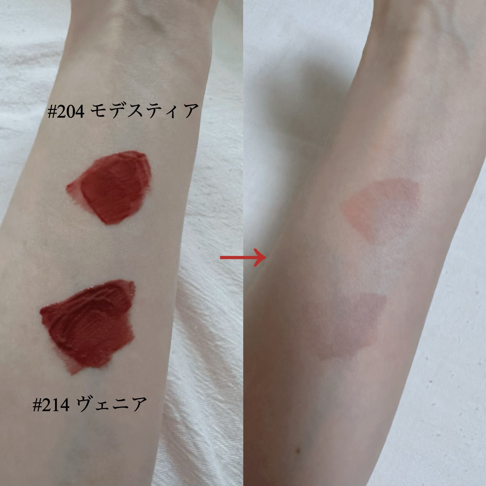 パッケージやカラーの名前もかっこよくて素敵なリップです✨ 214は限定オフライン販売らしいです。偶然お店で見つけて可愛い色味だったので購入してきました。 色持ちがとても良く、ウォータークレンジングで擦ってもなかなか落ちませんでした😸 可愛いくすみカラーと、つやつやなのにべたつかなくて使い心地がいい魅力的なリップで、つい他のカラーも集めたくなってしまいます! 本当に薄く甘い香りがします。 暗めのくすみカラーが大好きなのでとても刺さりました。