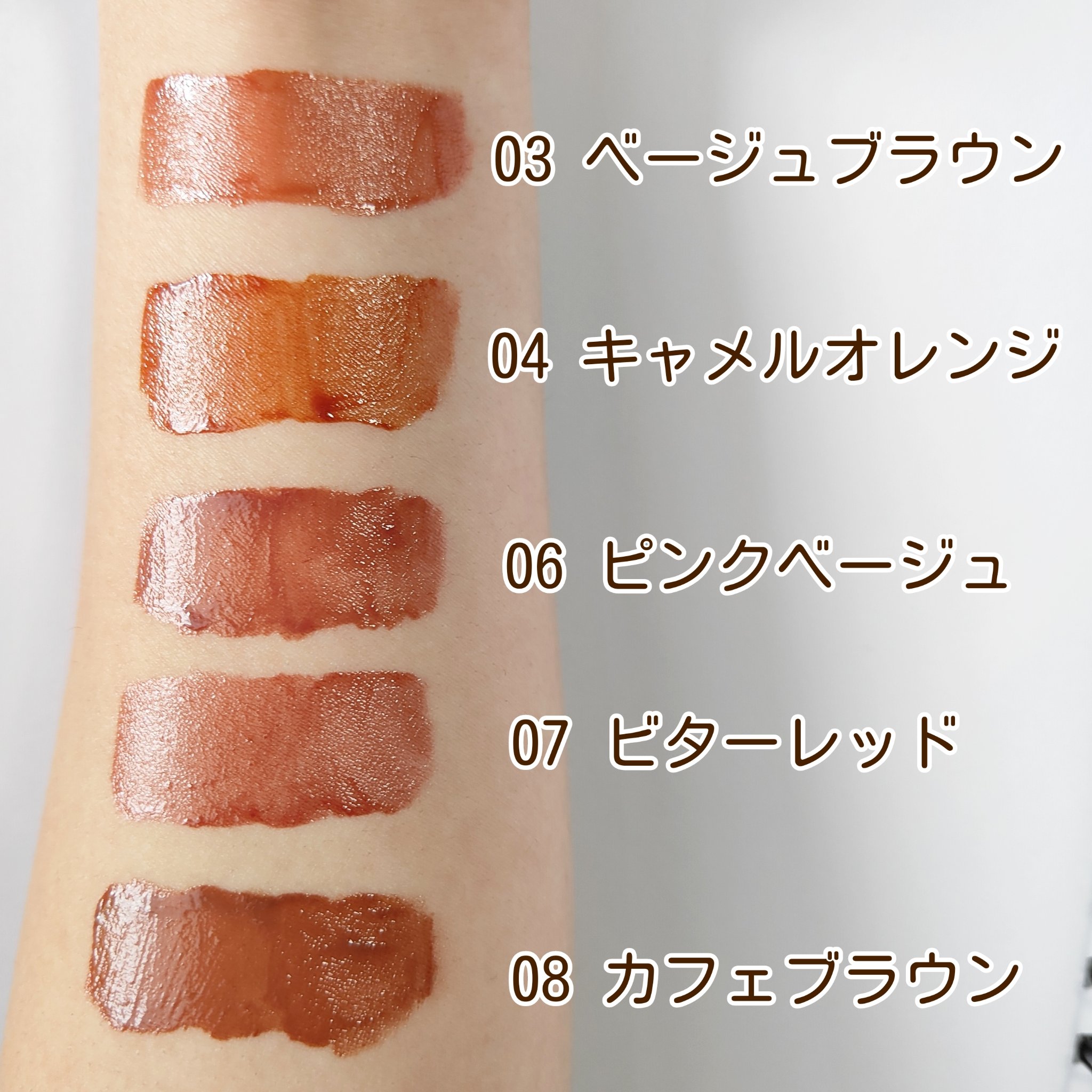 - <01 ナチュラルピンク> 水、ダイマージリノール酸(フィトステリル/イソステアリル/セチル/ステアリル/ベヘニル)、ダイマージリノール酸ダイマージリノレイル、ジフェニルシロキシフェニルトリメチコン、オクチルドデカノール、ラウロイルグルタミン酸ジ(フィトステリル/オクチルドデシル)、水添ポリイソブテン、BG、ジフェニルジメチコン、セテス-10、グリセリン、エタノール、セチルPEG/PPG-10/1ジメチコン、(アクリル酸ヒドロキシエチル/アクリロイルジメチルタウリンNa)コポリマー、イソヘキサデカン、フェノキシエタノール、メチルパラベン、トコフェロール、ポリソルベート60、エチルパラベン、デヒドロ酢酸Na、リン酸2Na、リン酸Na、イソステアリン酸ソルビタン、シメチコン、スクワラン、ハチミツ、ステアリン酸ソルビタン、ステアリン酸グリセリル、ローヤルゼリーエキス、オレイン酸ポリグリセリル-10、セルロースガム、ヒアルロン酸Na、ローズマリー葉エキス、カミツレ花エキス、水溶性コラーゲン、クエン酸、クエン酸Na、(+/-)ジカプリン酸ネオペンチルグリコール、トリイソステアリン酸ポリグリセリル-2、酸化チタン、マイカ、赤227、黄4、青1、水酸化Al、ポリアスパラギン酸Na、シリカ、キサンタンガム、EDTA-2Na、酸化鉄、PVP <02 コーラルレッド> 水、ダイマージリノール酸(フィトステリル/イソステアリル/セチル/ステアリル/ベヘニル)、ダイマージリノール酸ダイマージリノレイル、ジフェニルシロキシフェニルトリメチコン、オクチルドデカノール、ラウロイルグルタミン酸ジ(フィトステリル/オクチルドデシル)、水添ポリイソブテン、BG、ジフェニルジメチコン、セテス-10、グリセリン、エタノール、セチルPEG/PPG-10/1ジメチコン、(アクリル酸ヒドロキシエチル/アクリロイルジメチルタウリンNa)コポリマー、イソヘキサデカン、フェノキシエタノール、メチルパラベン、トコフェロール、ポリソルベート60、エチルパラベン、デヒドロ酢酸Na、リン酸2Na、リン酸Na、イソステアリン酸ソルビタン、シメチコン、スクワラン、ハチミツ、ステアリン酸ソルビタン、ステアリン酸グリセリル、ローヤルゼリーエキス、オレイン酸ポリグリセリル-10、セルロースガム、ヒアルロン酸Na、ローズマリー葉エキス、カミツレ花エキス、水溶性コラーゲン、クエン酸、クエン酸Na、(+/-)ジカプリン酸ネオペンチルグリコール、トリイソステアリン酸ポリグリセリル-2、酸化チタン、マイカ、赤227、黄4、青1、水酸化Al、ポリアスパラギン酸Na、シリカ、キサンタンガム、EDTA-2Na、酸化鉄、PVP <03 ベージュブラウン> 水、ダイマージリノール酸(フィトステリル/イソステアリル/セチル/ステアリル/ベヘニル)、ダイマージリノール酸ダイマージリノレイル、ジフェニルシロキシフェニルトリメチコン、オクチルドデカノール、ラウロイルグルタミン酸ジ(フィトステリル/オクチルドデシル)、水添ポリイソブテン、BG、ジフェニルジメチコン、セテス-10、グリセリン、エタノール、セチルPEG/PPG-10/1ジメチコン、(アクリル酸ヒドロキシエチル/アクリロイルジメチルタウリンNa)コポリマー、イソヘキサデカン、フェノキシエタノール、メチルパラベン、トコフェロール、ポリソルベート60、エチルパラベン、デヒドロ酢酸Na、リン酸2Na、リン酸Na、イソステアリン酸ソルビタン、シメチコン、スクワラン、ハチミツ、ステアリン酸ソルビタン、ステアリン酸グリセリル、ローヤルゼリーエキス、オレイン酸ポリグリセリル-10、セルロースガム、ヒアルロン酸Na、ローズマリー葉エキス、カミツレ花エキス、水溶性コラーゲン、クエン酸、クエン酸Na、(+/-)ジカプリン酸ネオペンチルグリコール、トリイソステアリン酸ポリグリセリル-2、酸化チタン、マイカ、赤227、黄4、青1、水酸化Al、ポリアスパラギン酸Na、シリカ、キサンタンガム、EDTA-2Na、酸化鉄、PVP <05 プラムレッド> 水、ダイマージリノール酸(フィトステリル/イソステアリル/セチル/ステアリル/ベヘニル)、ダイマージリノール酸ダイマージリノレイル、ジフェニルシロキシフェニルトリメチコン、オクチルドデカノール、ラウロイルグルタミン酸ジ(フィトステリル/オクチルドデシル)、水添ポリイソブテン、BG、ジフェニルジメチコン、セテス-10、グリセリン、エタノール、セチルPEG/PPG-10/1ジメチコン、(アクリル酸ヒドロキシエチル/アクリロイルジメチルタウリンNa)コポリマー、イソヘキサデカン、フェノキシエタノール、メチルパラベン、トコフェロール、ポリソルベート60、エチルパラベン、デヒドロ酢酸Na、リン酸2Na、リン酸Na、イソステアリン酸ソルビタン、シメチコン、スクワラン、ハチミツ、ステアリン酸ソルビタン、ステアリン酸グリセリル、ローヤルゼリーエキス、オレイン酸ポリグリセリル-10、セルロースガム、ヒアルロン酸Na、ローズマリー葉エキス、カミツレ花エキス、水溶性コラーゲン、クエン酸、クエン酸Na、(+/-)ジカプリン酸ネオペンチルグリコール、トリイソステア