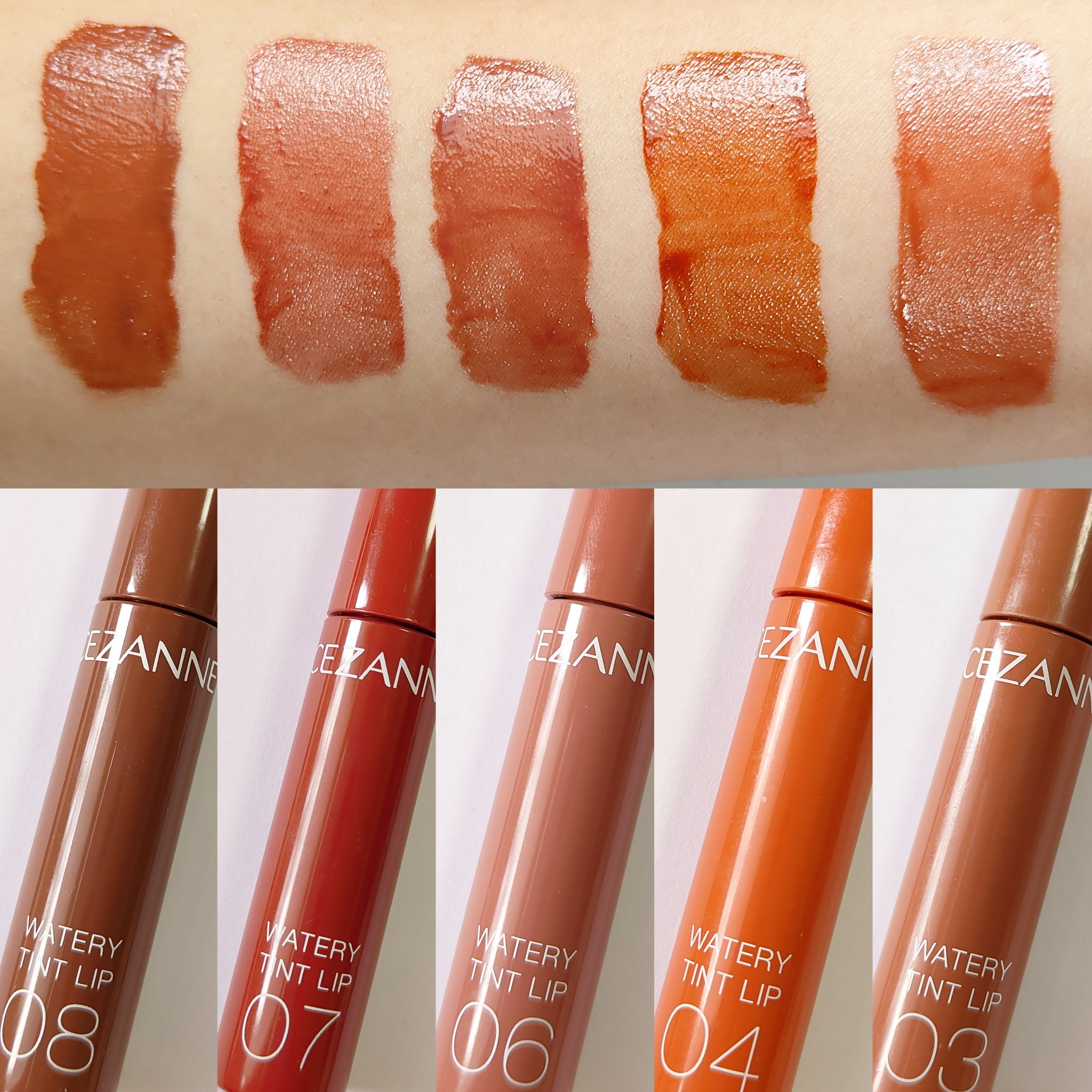 CEZANNEのウォータリーティントリップから新色が出た〜(*˘︶˘*).。.:*♡ということで全色スウォッチいってみたいと思います🙌🏻💕濡れたようなツヤが長時間持続するティントルージュ。水に濡れたような軽やかなツヤが持続✨唇に色がフィットし...