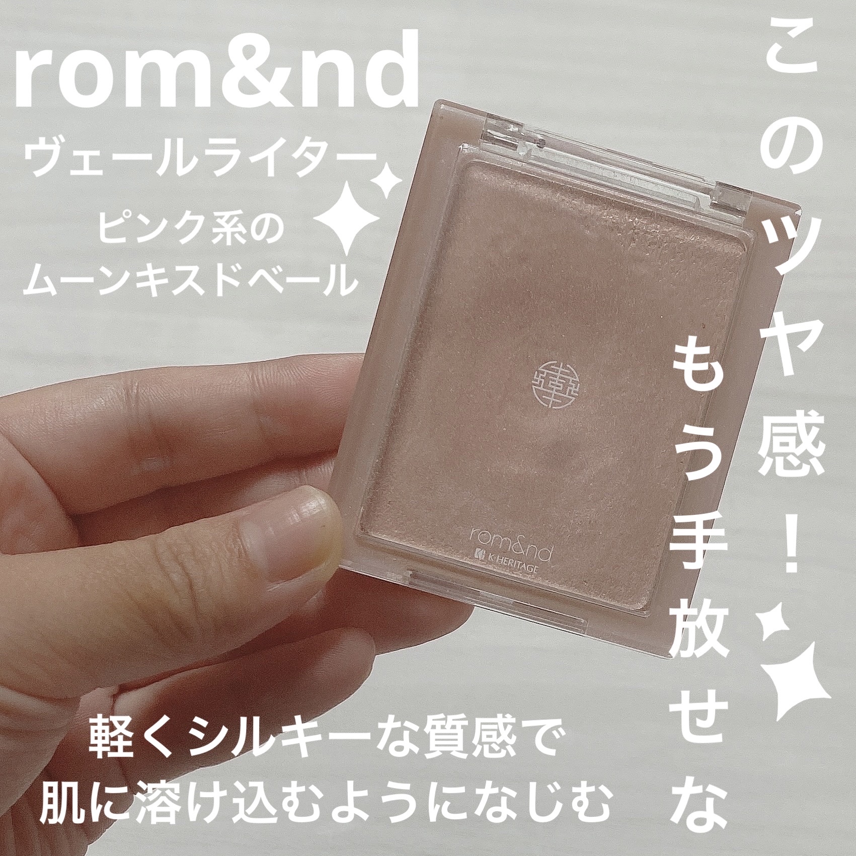 rom&ndヴェールライター02ムーンキスドベールmoonkissedveil🎀ピンク色の艶で、多幸感溢れる肌にしてくれます。チークの代わりや涙袋に使っても可愛いです。チークと鼻の頭にぬると統一感が出るからおすすめ✨バズっただけあるよね!いつ...