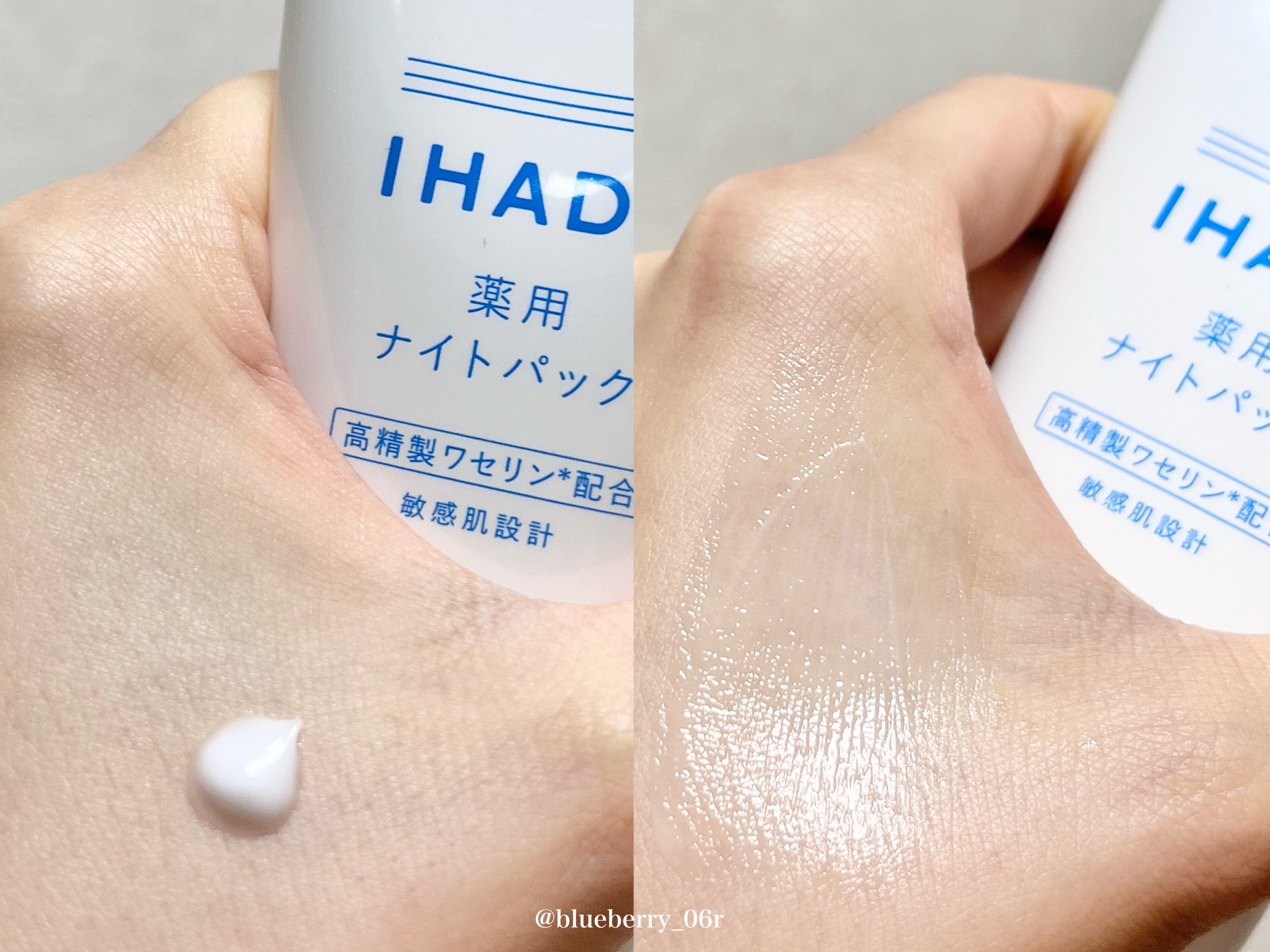 - 【医薬部外品】 新パッケージへリニューアル。 繰り返しがちな肌荒れ・乾燥を防ぐ、夜の集中ケアパックです。 やさしく肌に広がるクリーミーなバームのパックで、べたつかずに一晩中密封してうるおいが続き、翌朝なめらかな肌に整えます。 クリームのなめらかさとバームの密封力を実現したハイブリッドケア処方。 蓄積した、乾燥など日中に受けた肌ダメージ対策に、塗って寝るだけの簡単ケア。 2つの肌荒れ防止有効成分:トラネキサム酸、グリチルリチン酸ジカリウム配合 肌うるおいバリア保護成分:高精製ワセリン配合 うるおいバリア機能を整えながら、角層のすみずみまでうるおいで満たし、すこやかな環境に導きます。 敏感肌設計 ○厳選原料・成分配合 ○パラベン(防腐剤)無添加、アルコール(エチルアルコール)無添加 ○無香料、無着色、弱酸性〇アレルギーテスト済み・ニキビのもとになりにくい処方(全てのかたにアレルギーが起きない、また、ニキビができないわけではありません。) 販売名:イハダ 薬用ナイトバーム ※商品の改良や表示方法の変更などにより、実際の成分と一部異なる場合があります。実際の成分は商品の表示をご覧ください。