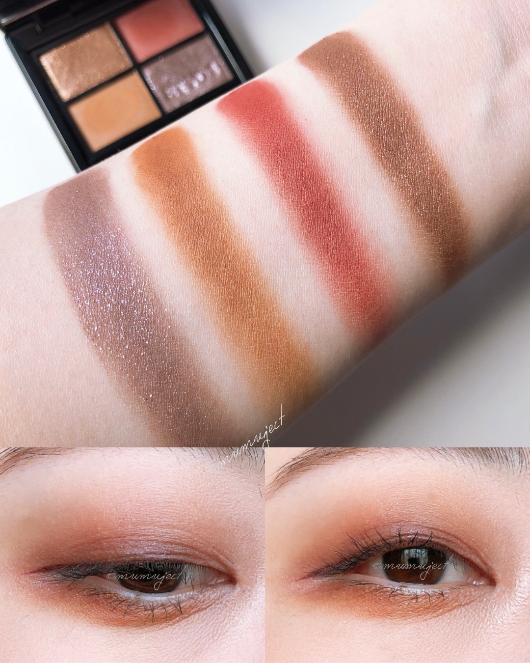 ゴールドとピンクを中心とした多色パール。 それらが交わってできる輝きと濡れ感が高貴な感じがして、使うたびに嬉しくなります。 深みと透明感が両立していて、そのニュアンスや空気感を存分に楽しむような、そんなパレットです。 4色を重ねていくにつれてアンニュイな雰囲気で満たされていきます。