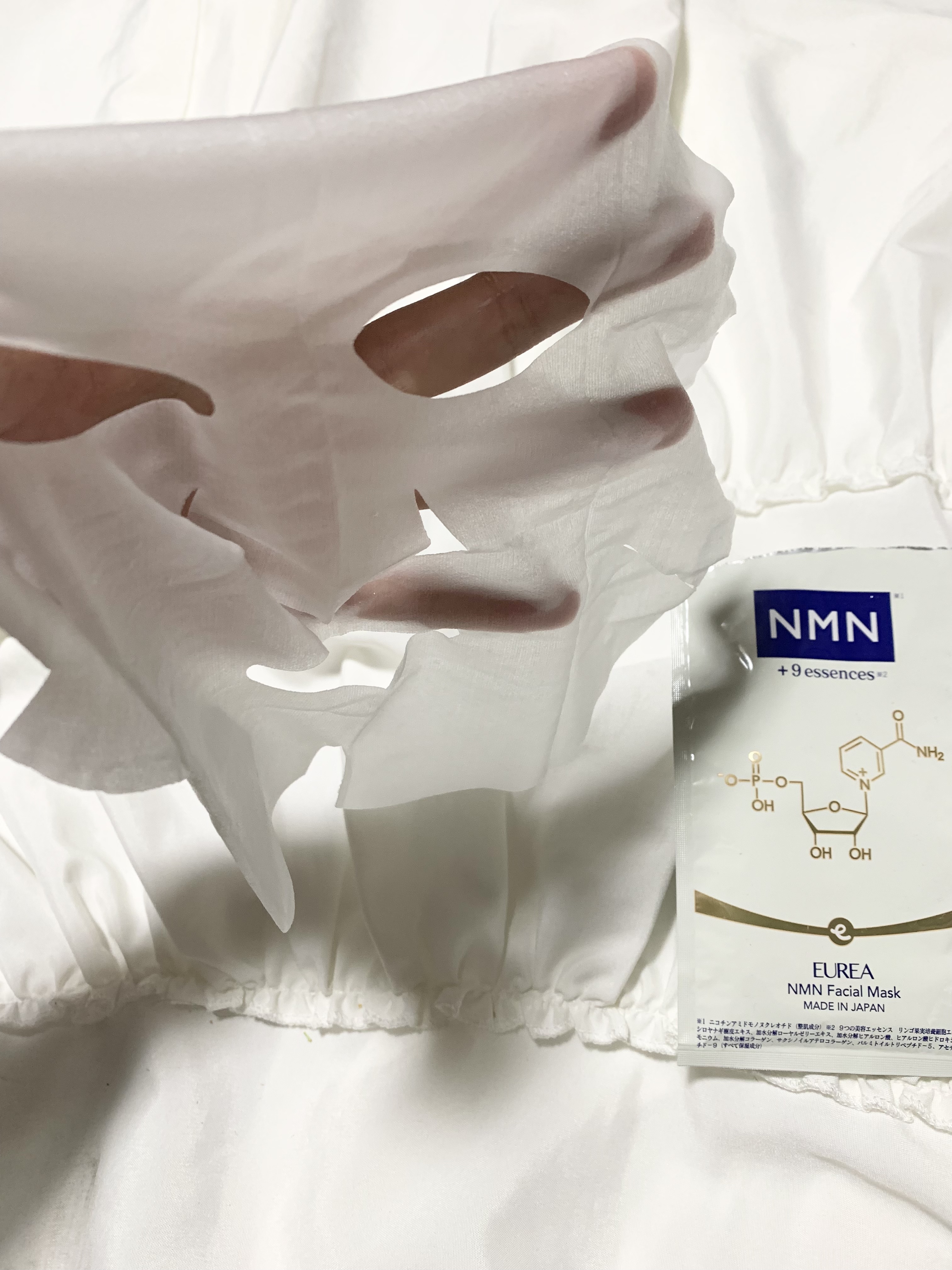 美容成分『NMN』高配合のシートマスク♡ 純度99.5%以上の国産NMNが たっぷり10mgも配合されたシートマスク。 NMNって壊れやすくてデリケート。 形状を保ちながら高配合するのは 簡単じゃないそうです💦 配合されてるNMNは酵母由来なので、 保管は冷蔵庫がオススメ✨ そんなNMNに加えて、 NMNを高め合う9種類の美容成分を 絶妙なバランスで配合👍 NMNの効能を最大限引き立てて お肌に届けてくれる、って感じの 贅沢シートマスクですね😍 大阪大学発のベンチャー企業「株式会社バイユーアナリティカ」と共同開発の商品らしくて、他とはちがうスキンケアを一足先に体験している感じも良かったです😊